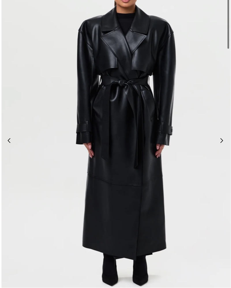 Our vegan leather oversized trench coat will complement your cold weather fits. Designed with a luxurious smooth and buttery feel, notched collar and lapel, power shoulders, belted tie closure at the waist and back storm flap detail. Raw edge trim and adjustable hardware at the cuffs with loops com