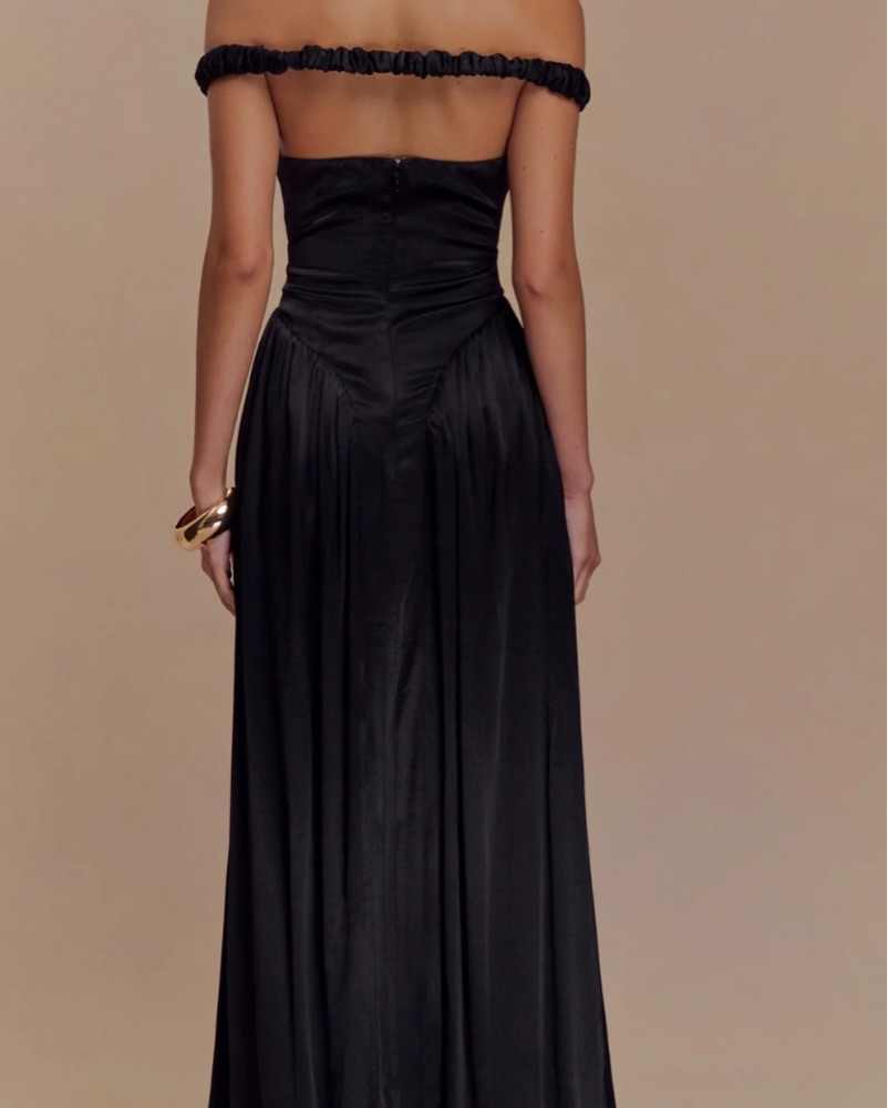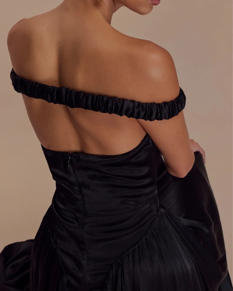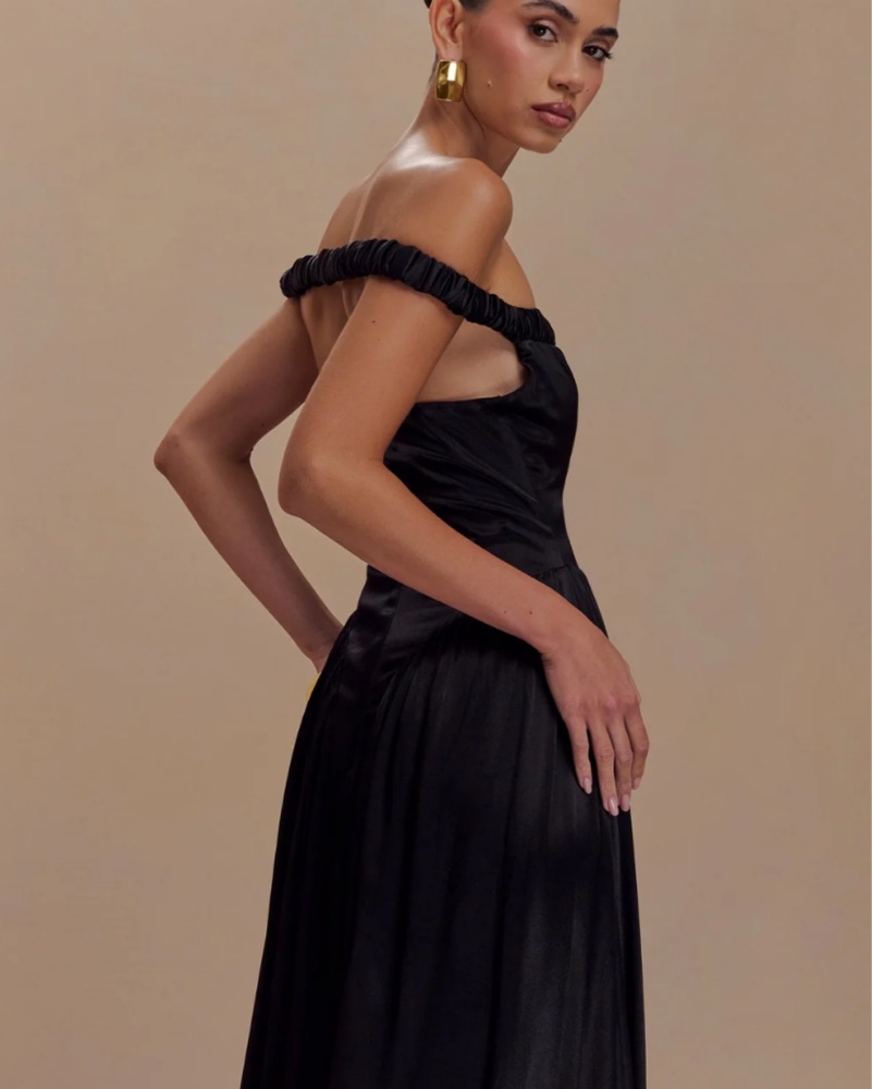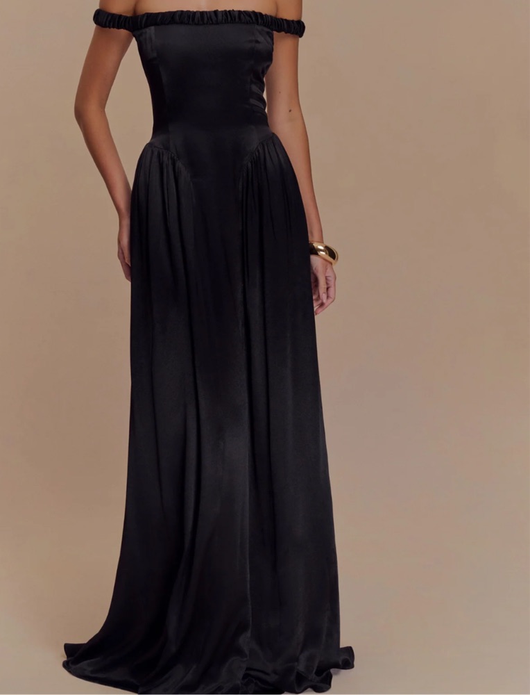 This elegant off-the-shoulder black gown is perfect for a formal event or special occasion. The flowing, A-line silhouette and ruched bodice create a flattering and sophisticated look.