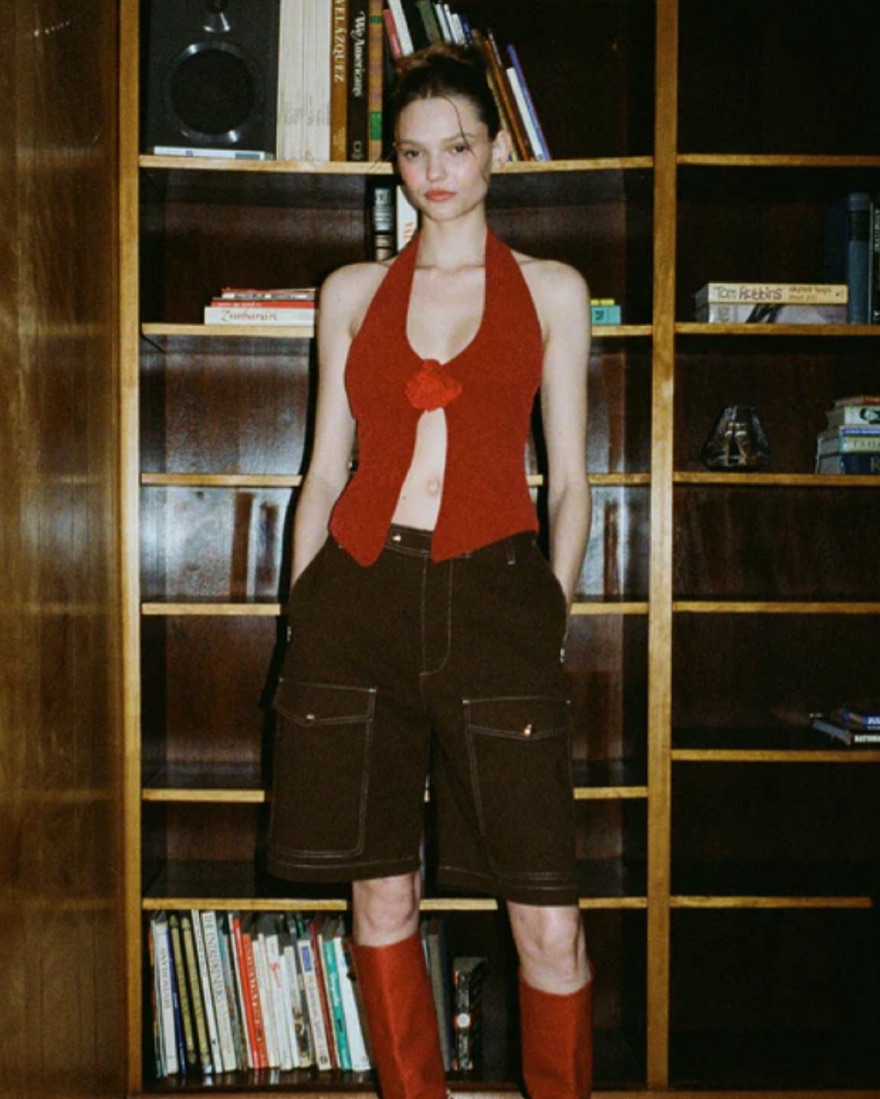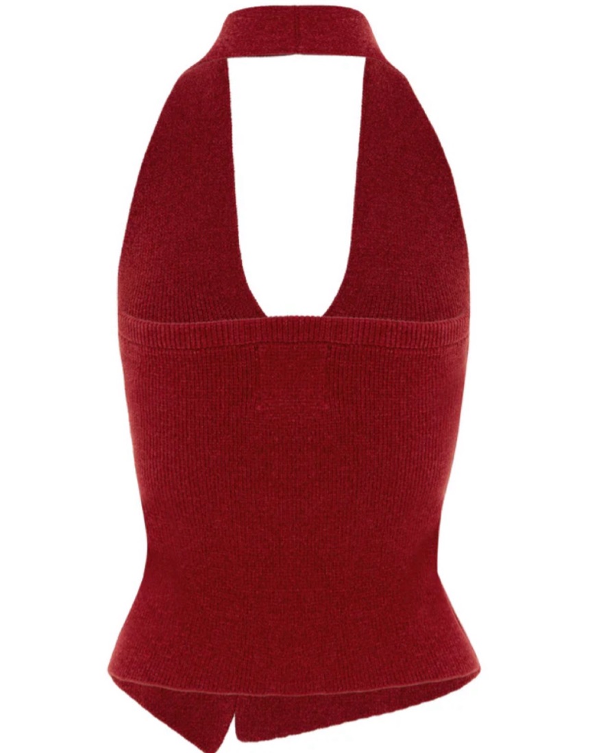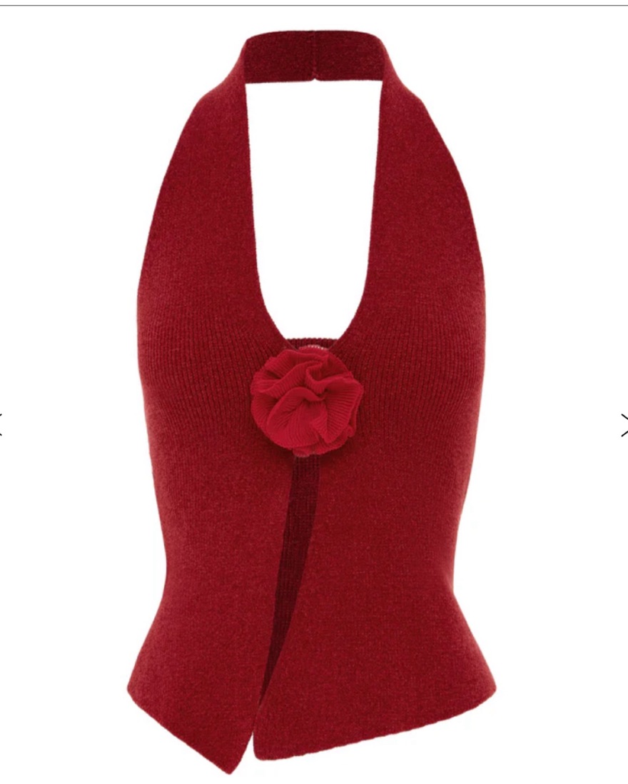 Rose top - Red. The Rose Top is a halter neck style top with an open front design featuring a self fabricated flower at the bust.