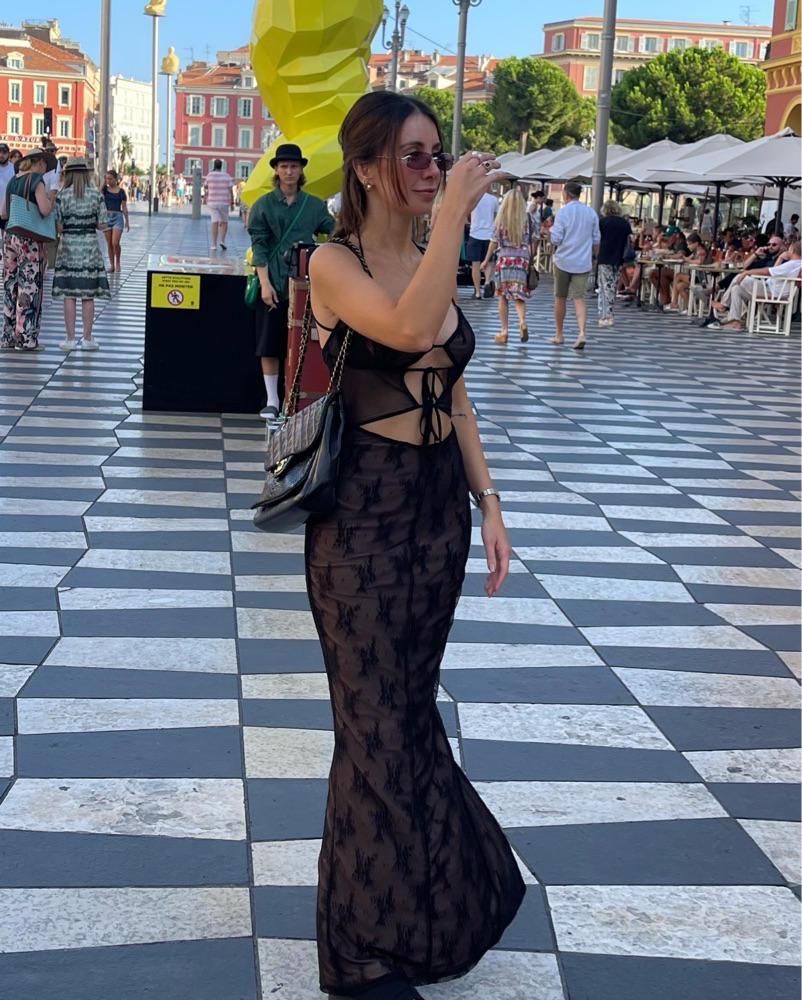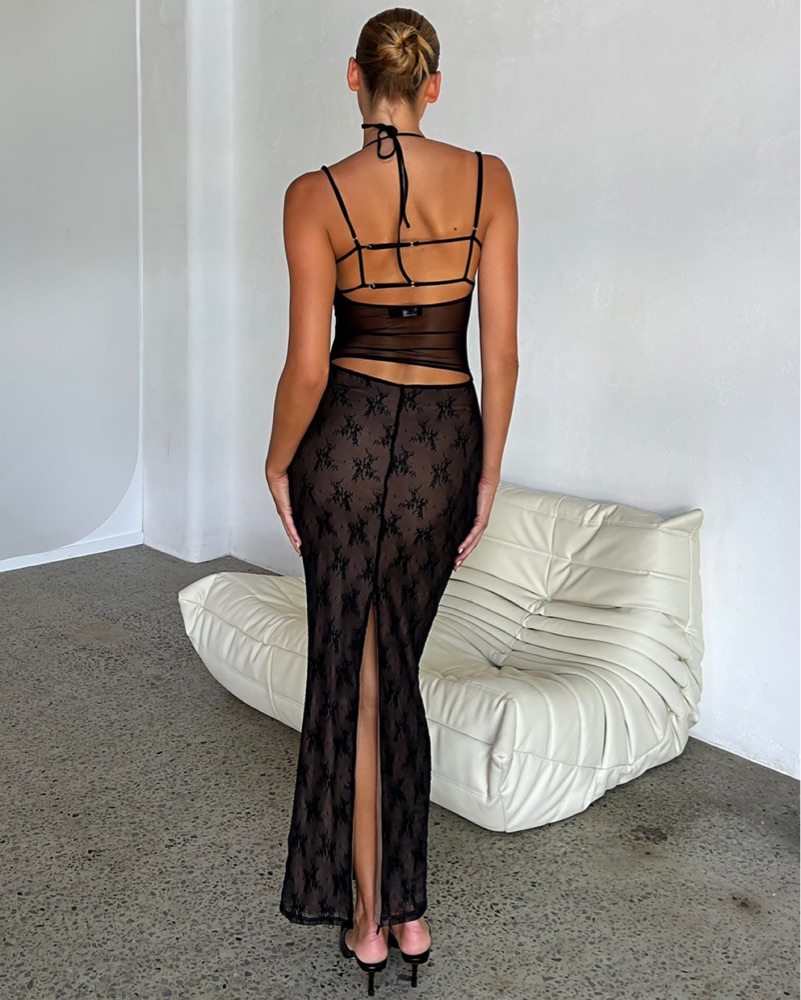 This captivating black lace gown is perfect for a night out on the town or a special occasion. The sultry cutouts and form-fitting silhouette create a striking, yet elegant look.