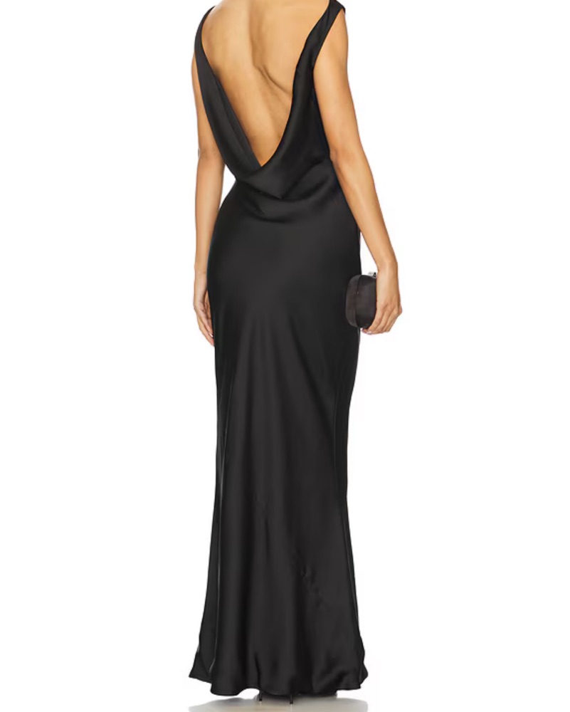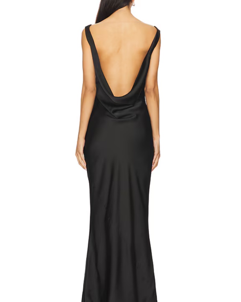 This stunning black satin gown is perfect for a formal event. The draped, open back design creates a sophisticated and alluring look.