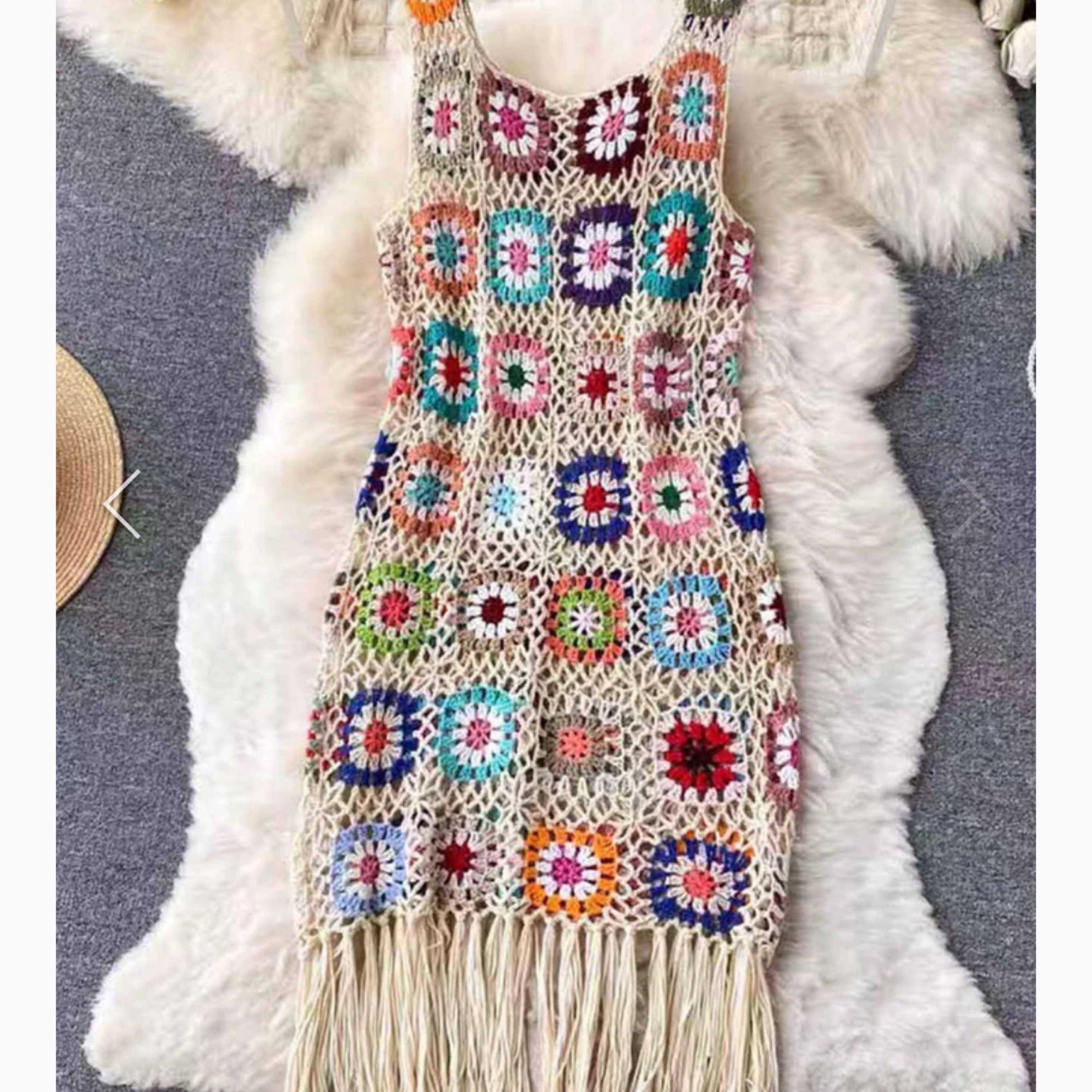 Crocheted granny square dress with fringe, midi length. Super cute over a bathing suit or bodysuit! Not lined. Colors used on my dress are slightly different than stock photo. Could fit small/medium
