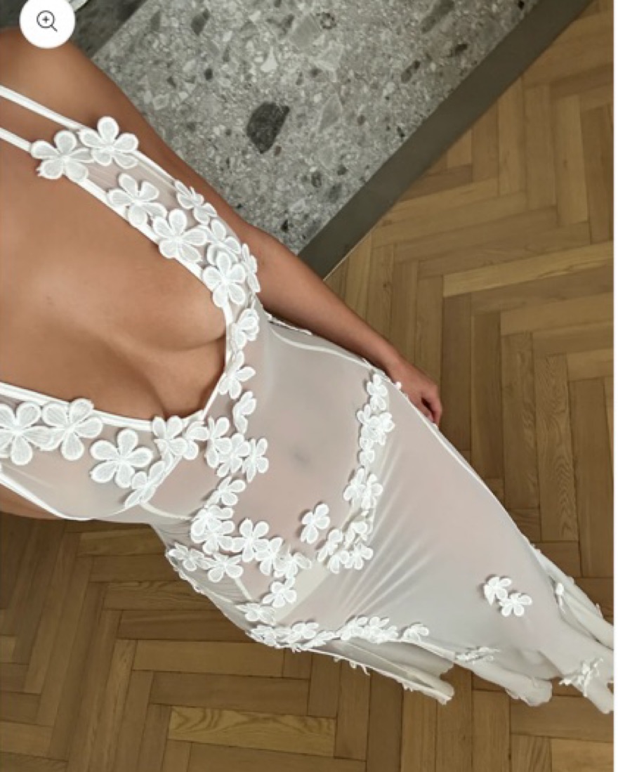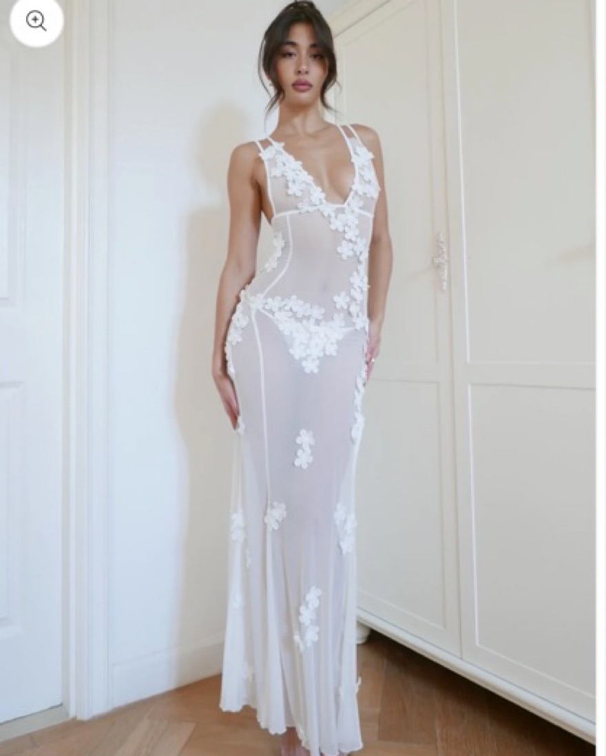 Sheer white maxi dress with 3D flowers embroidered. Is a size M but runs VERY small and fits more like a S. **Underwear not included. Will charge for self tanner stains.