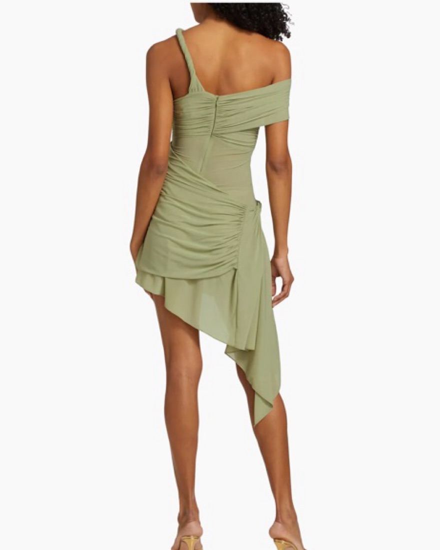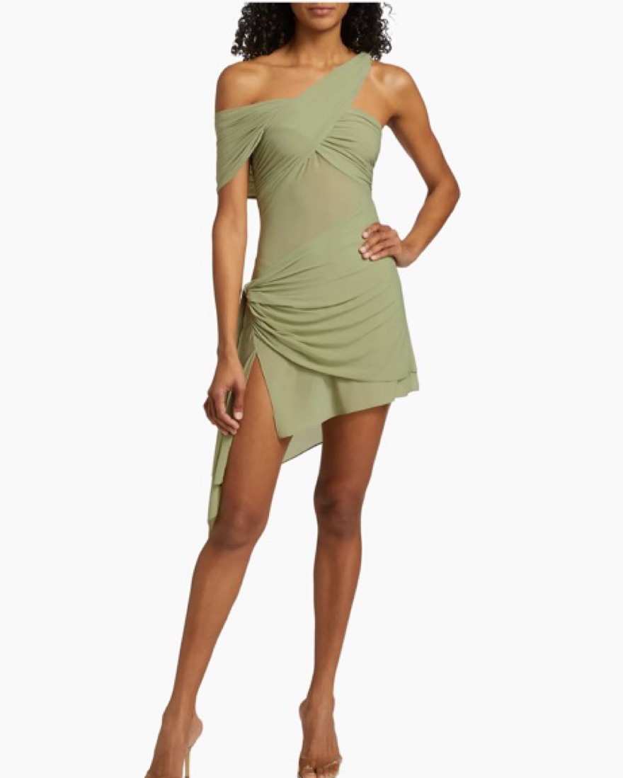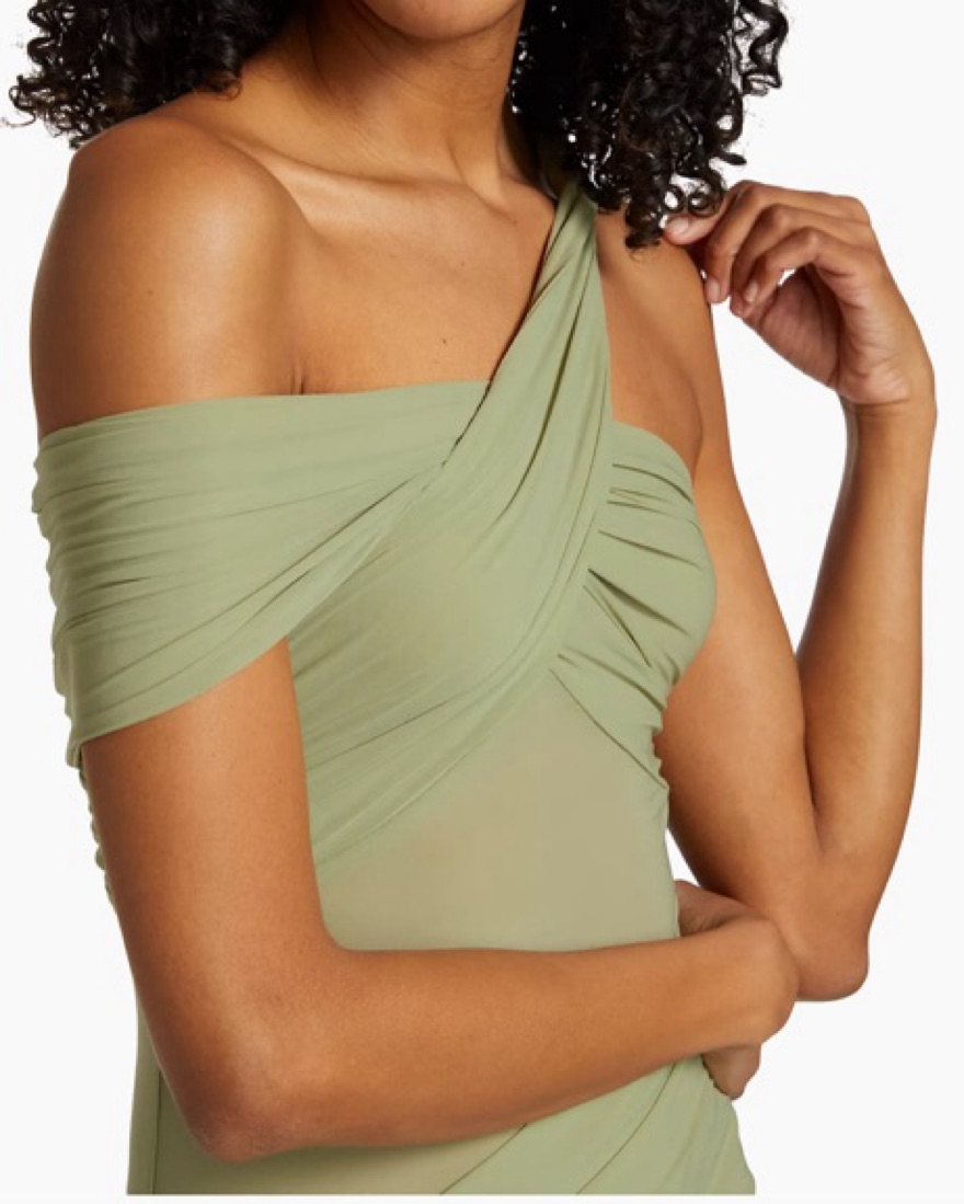 In the pistachio color. Material is slinky but stretchy, with a slight sheer panel over midriff. So flattering.