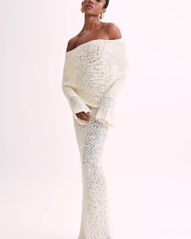 Off shoulder ivory boucle maxi dress . Super comfortable and great for a cozy date night.