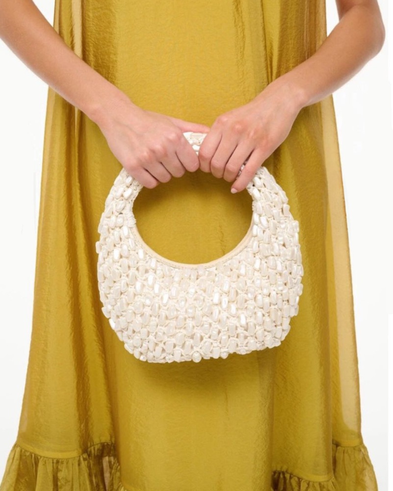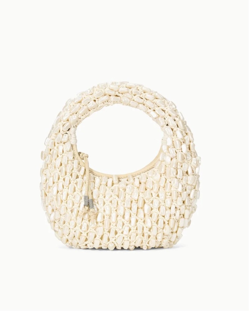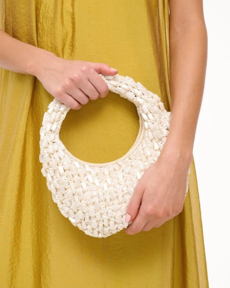 The Reef Bag is a hand held novelty bag crocheted with pearlescent beads. This cream bag features a curved top handle and a zipper closure.