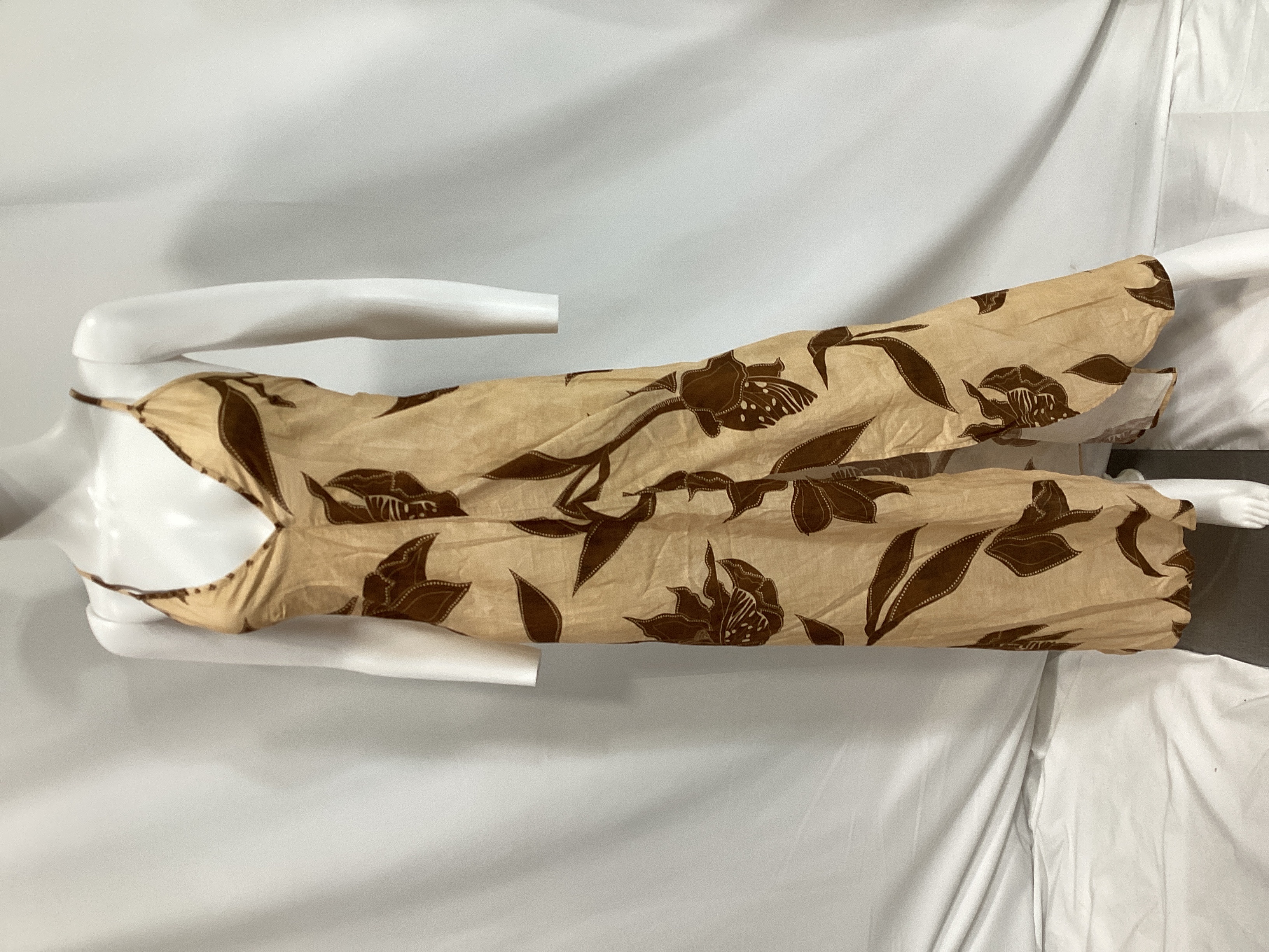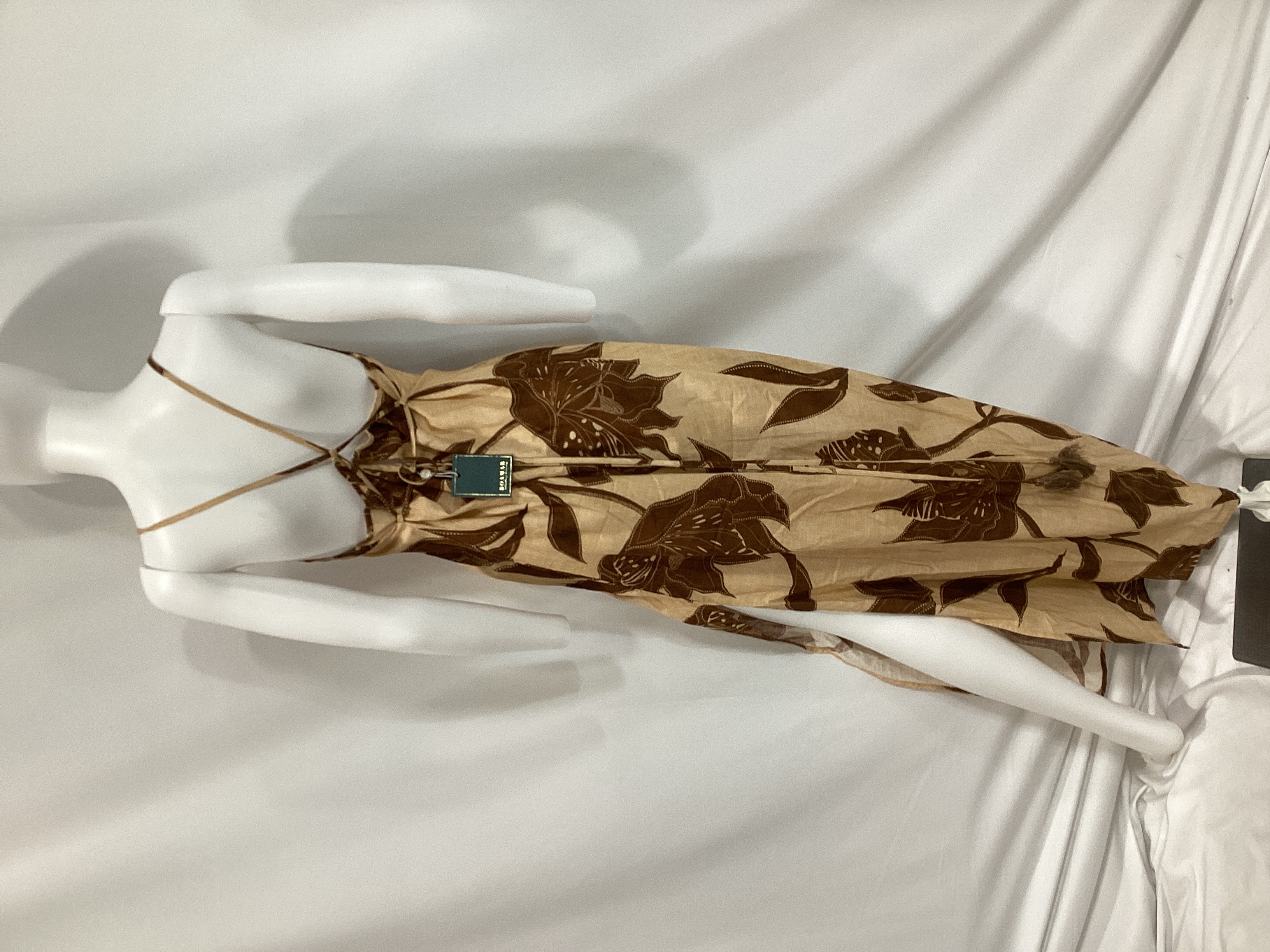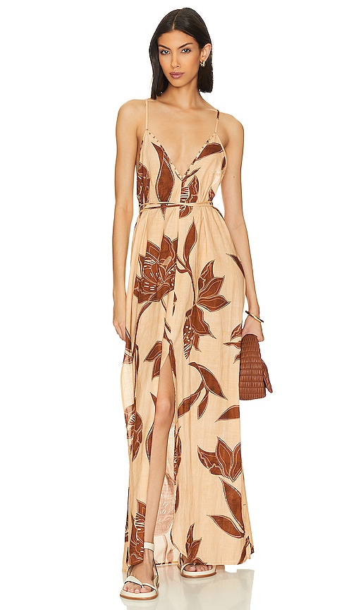 Flowing silhouette with a romantic floral print perfect for garden parties or weekend brunches. The coffee-toned blooms add effortless elegance to any warm-weather occasion.