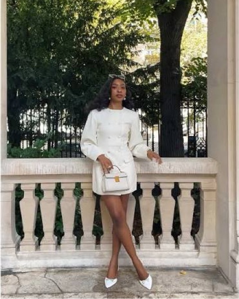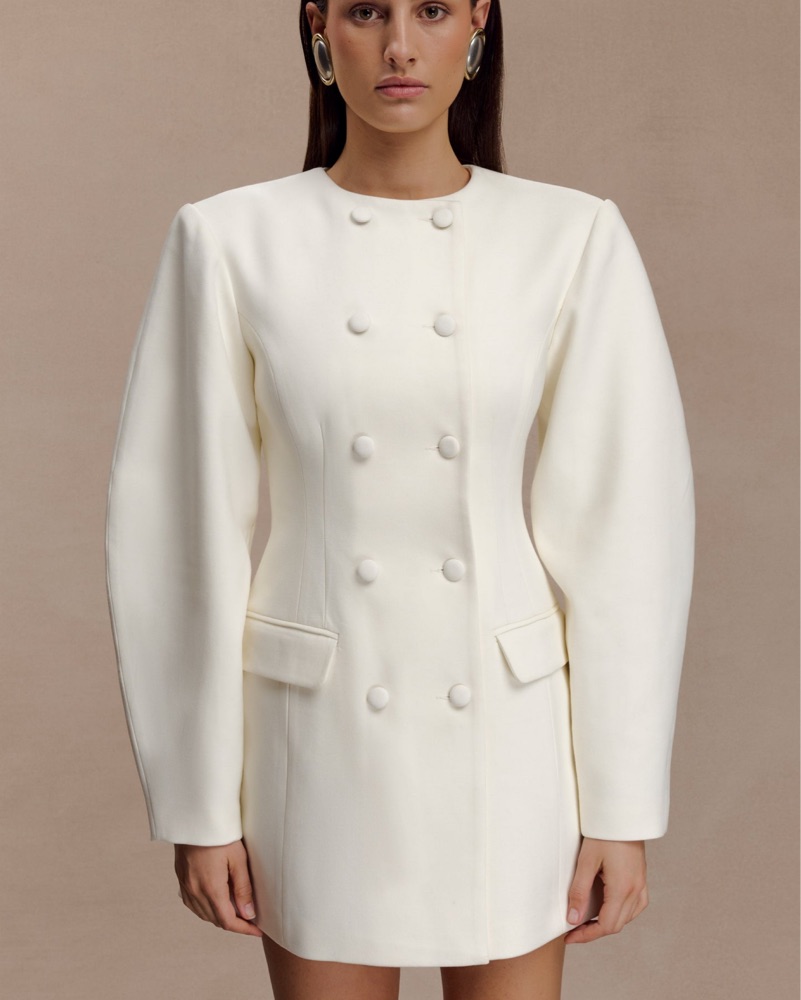 Designed with long balloon sleeves and a high neckline, it balances sharp tailoring with soft volume. Non-functional pocket flaps add structure, while the back belt with a custom buckle cinches the waist for a flattering fit. Shoulder pads, and a double button front closure.
