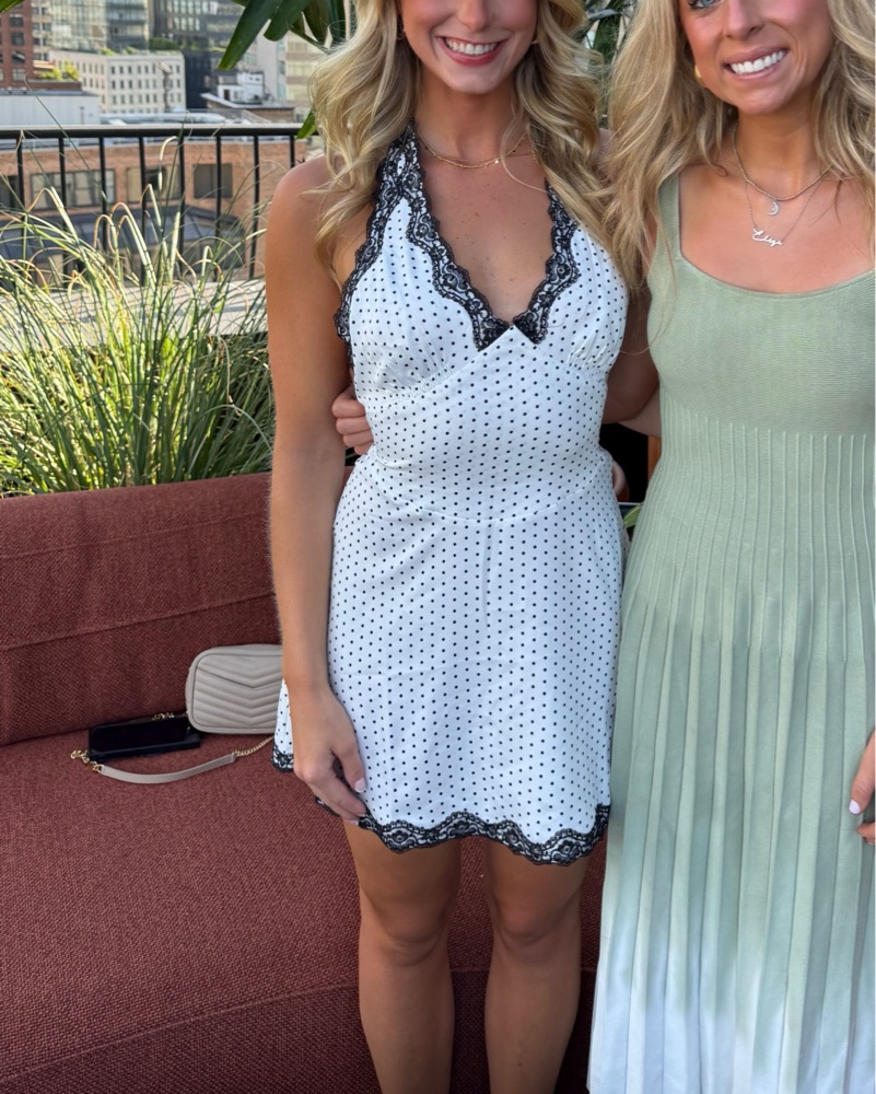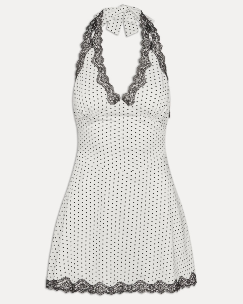 Frankie’s Bikinis Audrey Satin Mini Dress in White Polka dot so cute and perfect for summer