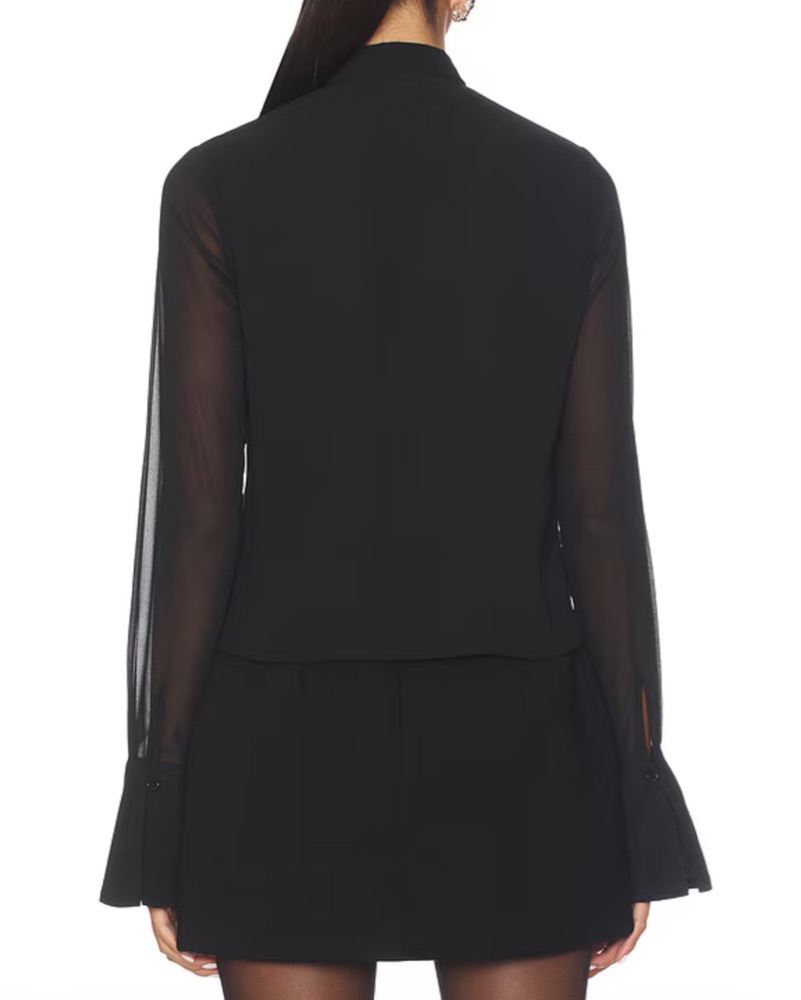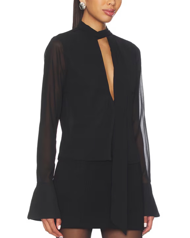 ALL THE WAYS Pennie Top in Black from Revolve. Worn once and on pre-order. Semi-sheer sleeves and front snap button closure. Attached neck scarf that can be tied different ways with deep open V cut