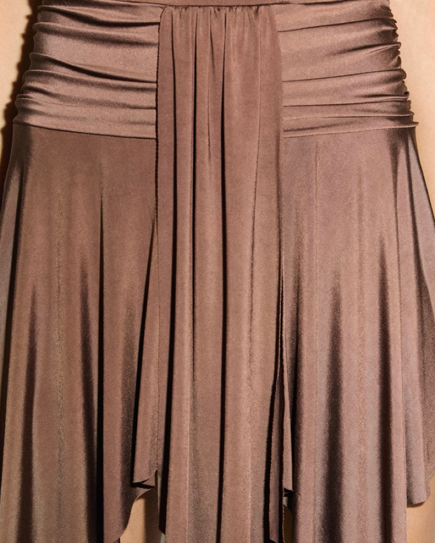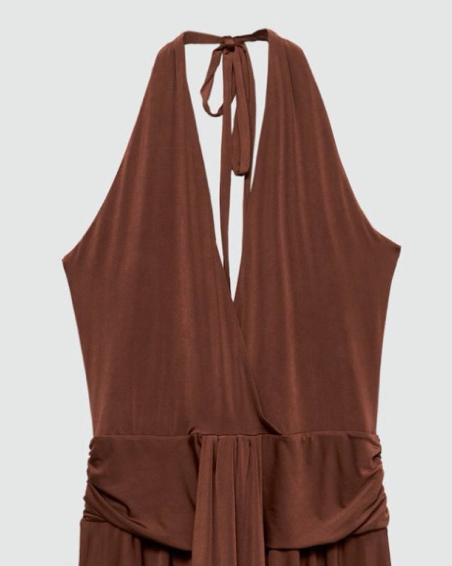 Flowy fabric. Circular knit. Short design. Straight design. Asymmetric design. Halter neck. V-neck. Sleeveless. Unclosed. Decorative bow. Draped details.