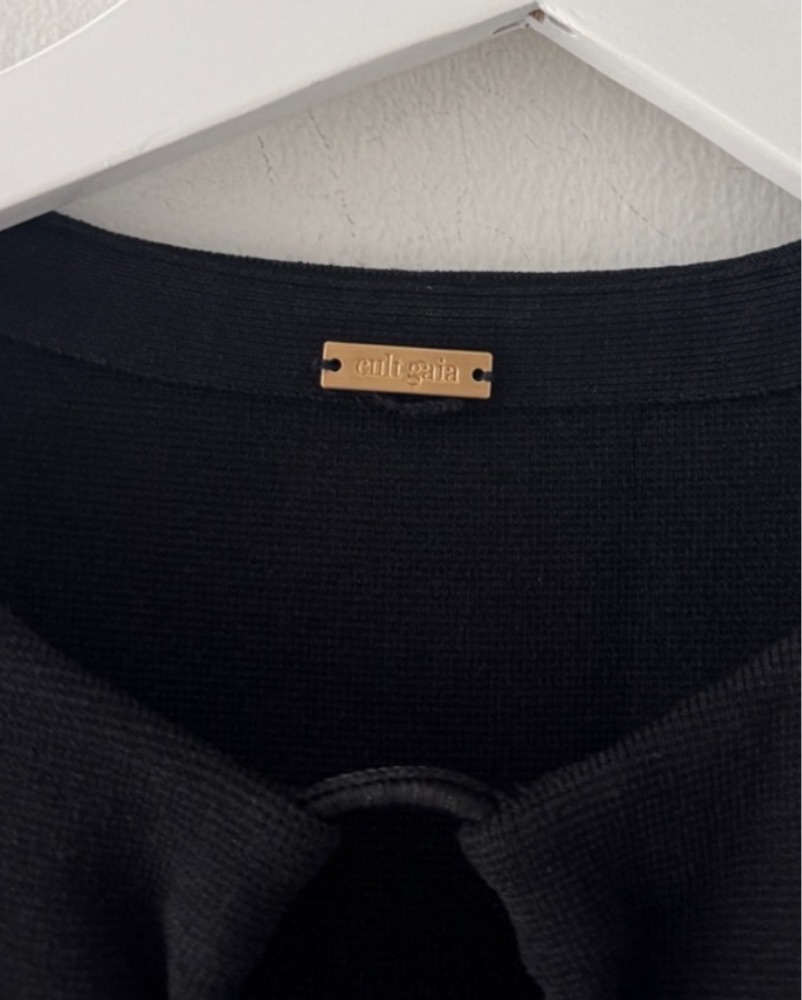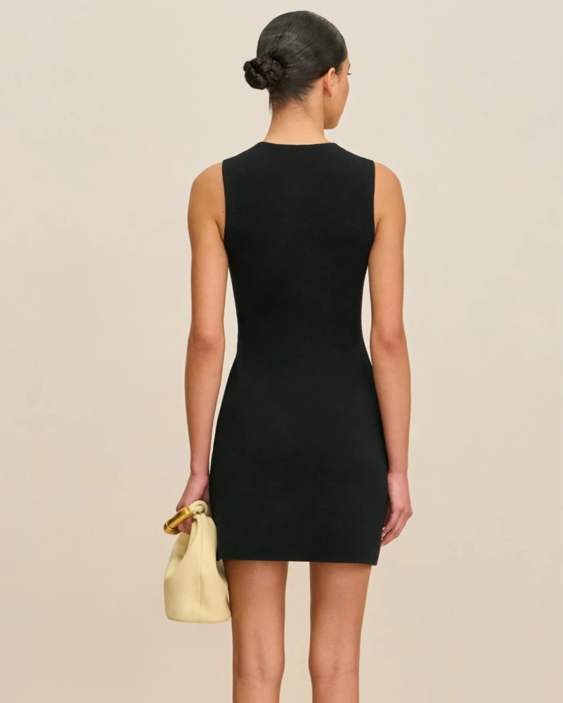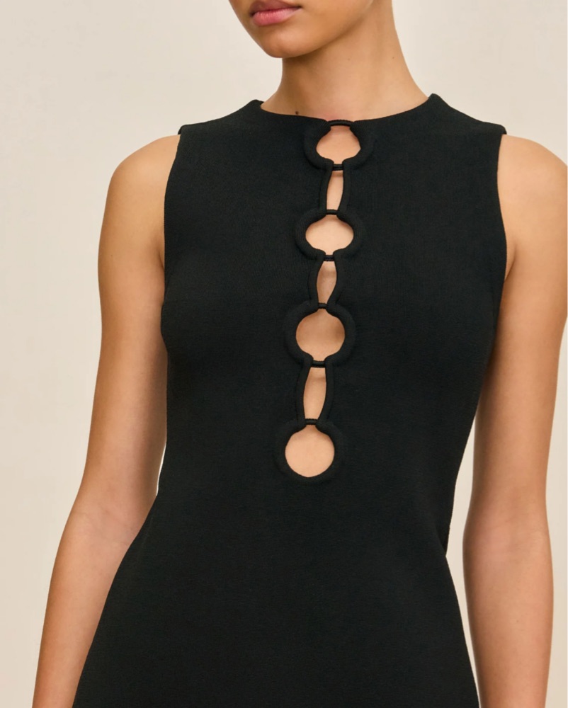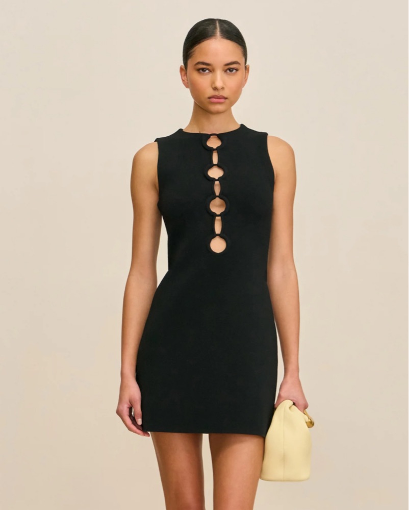 A knit mini dress with cutout details adorning the front. — Mini length — Back zipper closure — Cutout details at bust — Knit blend