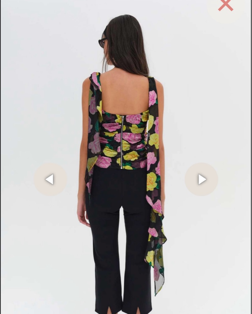This stunning blouse from For Love And Lemons features a one-shoulder design with vibrant pink floral prints on a black background. The asymmetrical cut and dramatic draping create a captivating silhouette, making it a standout piece for any occasion.