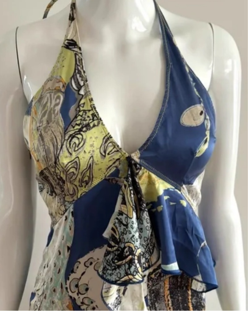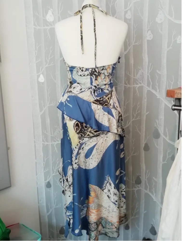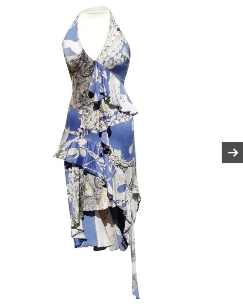 This stunning high low dress features a bold floral print in a variety of colors. Perfect for a summer wedding or vacation. Dry cleaning is mandatory.
