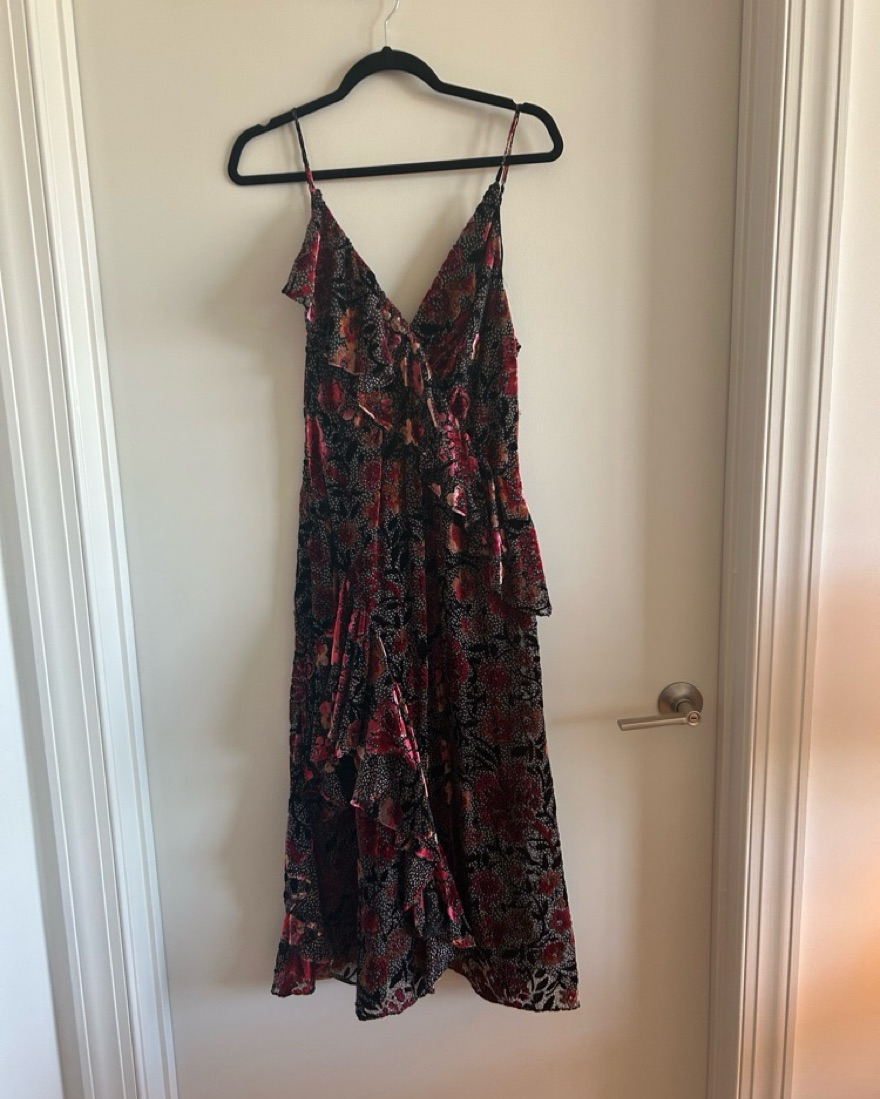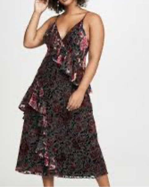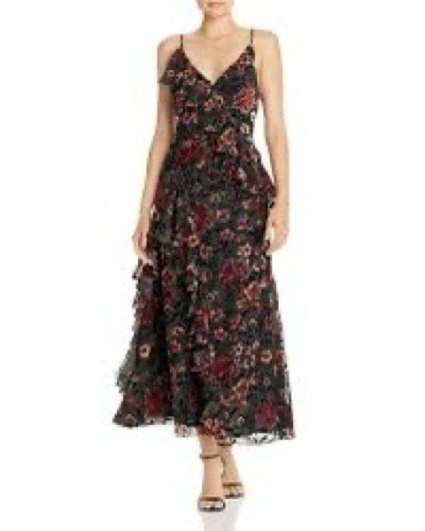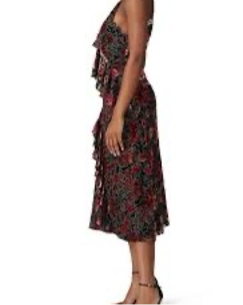 This eye-catching midi dress is perfect for a summer wedding or garden party. The bold floral print and ruffled design add a elegant, feminine flair.