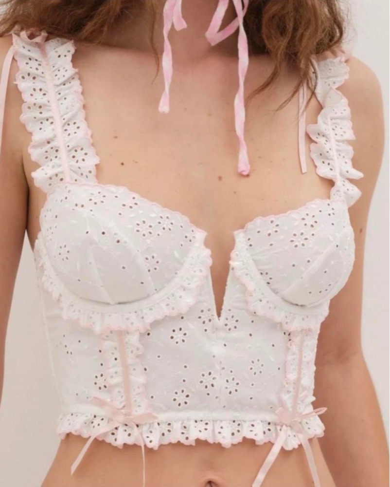 For Love and Lemons Eyelet Bustier with adjustable straps and back. Perfect paired over a dress or with a high waisted skirt or pants. Great summer or bridal look. Size 34D. Perfect condition, worn once