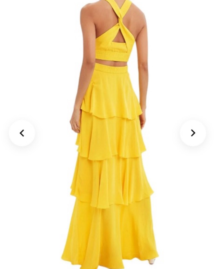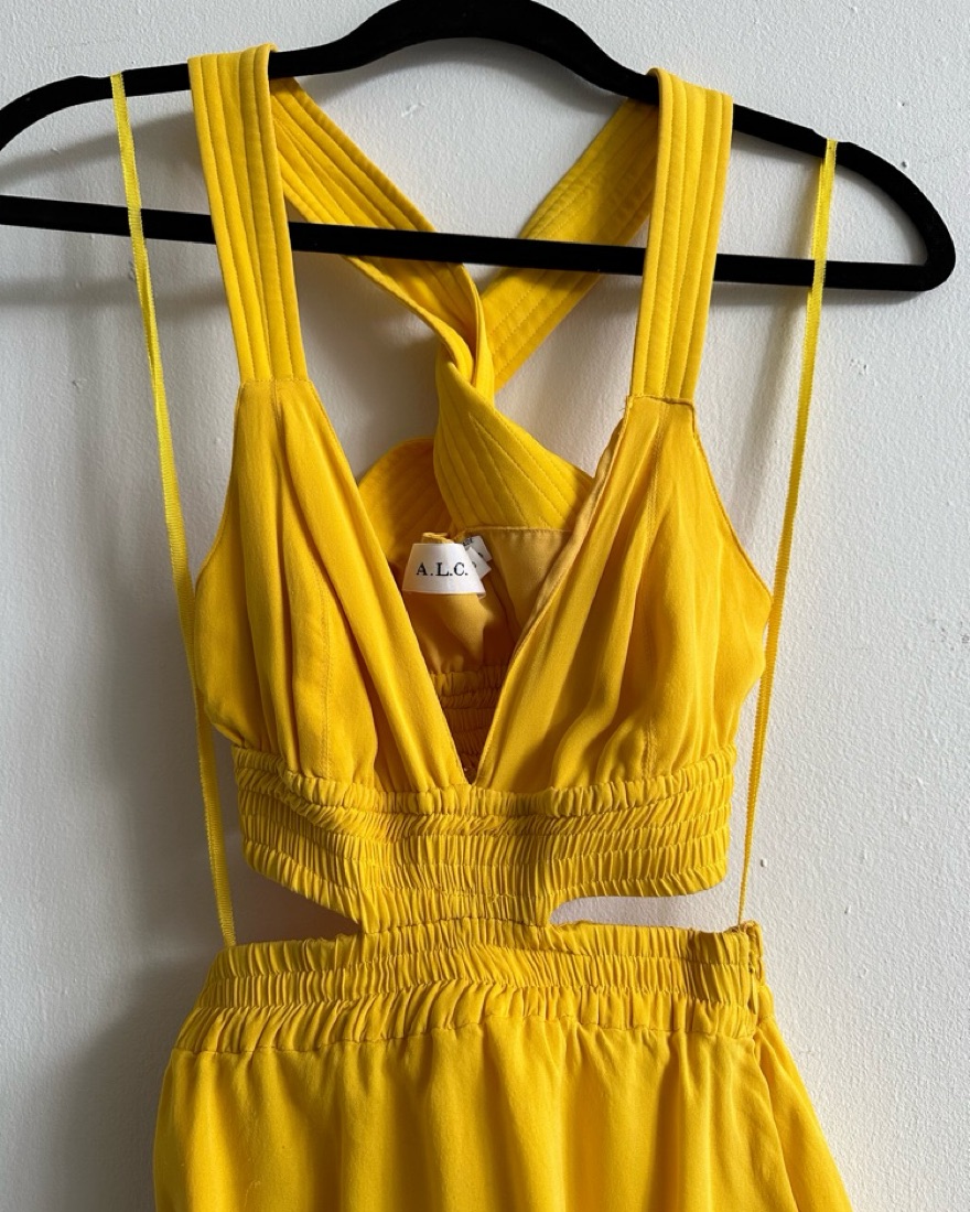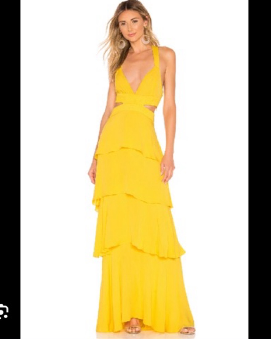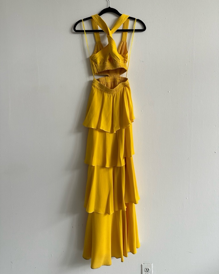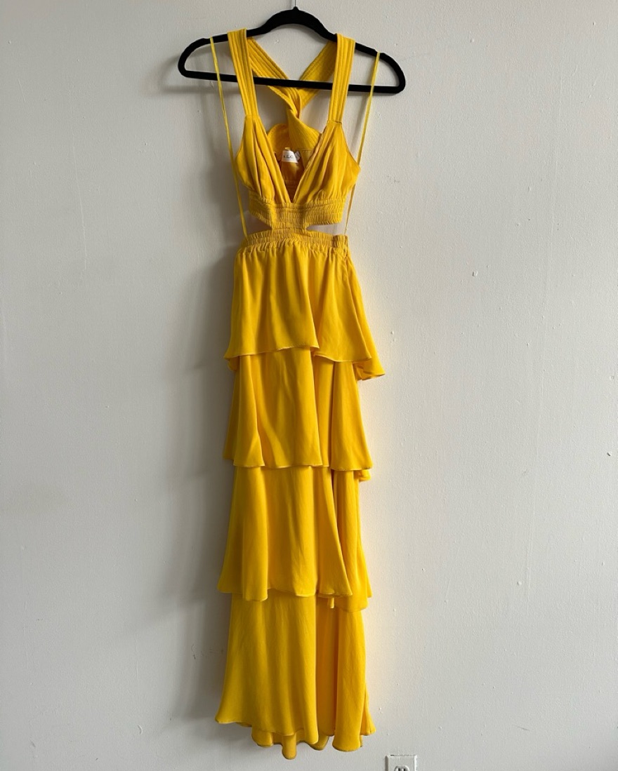 Gorgeous yellow silk gown with cut out and crossed back detail. Worn as a wedding guest in mexico and puerto rico and was perfect for both! This is originally a size zero and was altered to be a but smaller around the upper elastic. Full length, ruffle tiers. Flows beautifully when you walk!