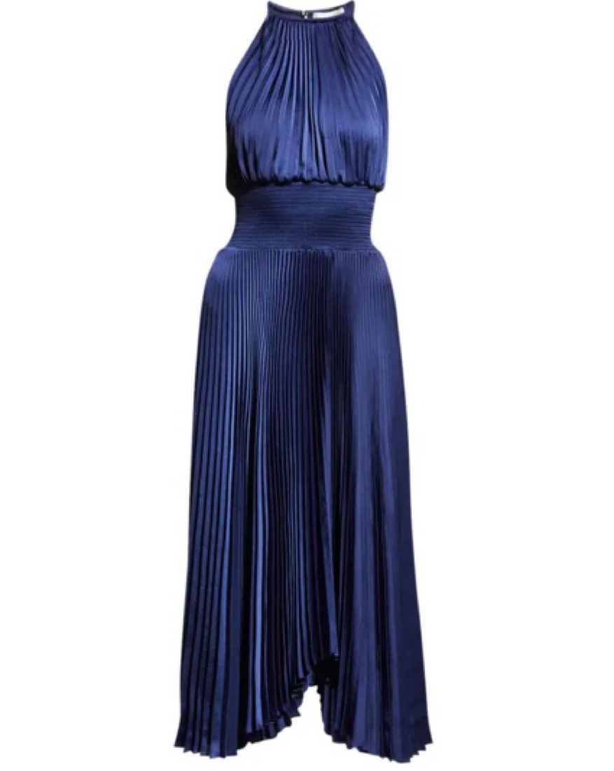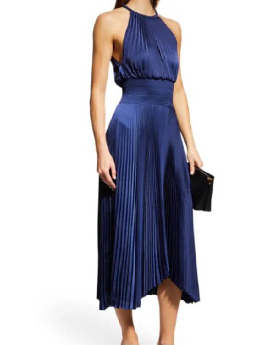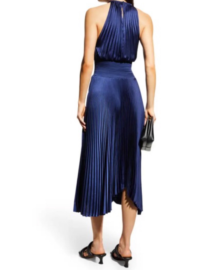 Worn only once! A.L.C. "Renzo II" satin pleated high-neck midi dress Sleeveless Smocked waistband A-line silhouette Handkerchief hem Back keyhole closure Polyester Dry clean Imported