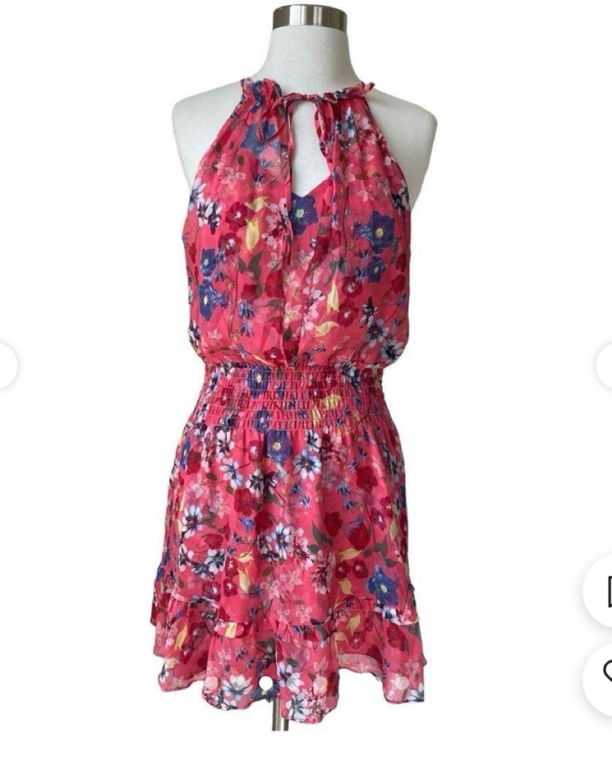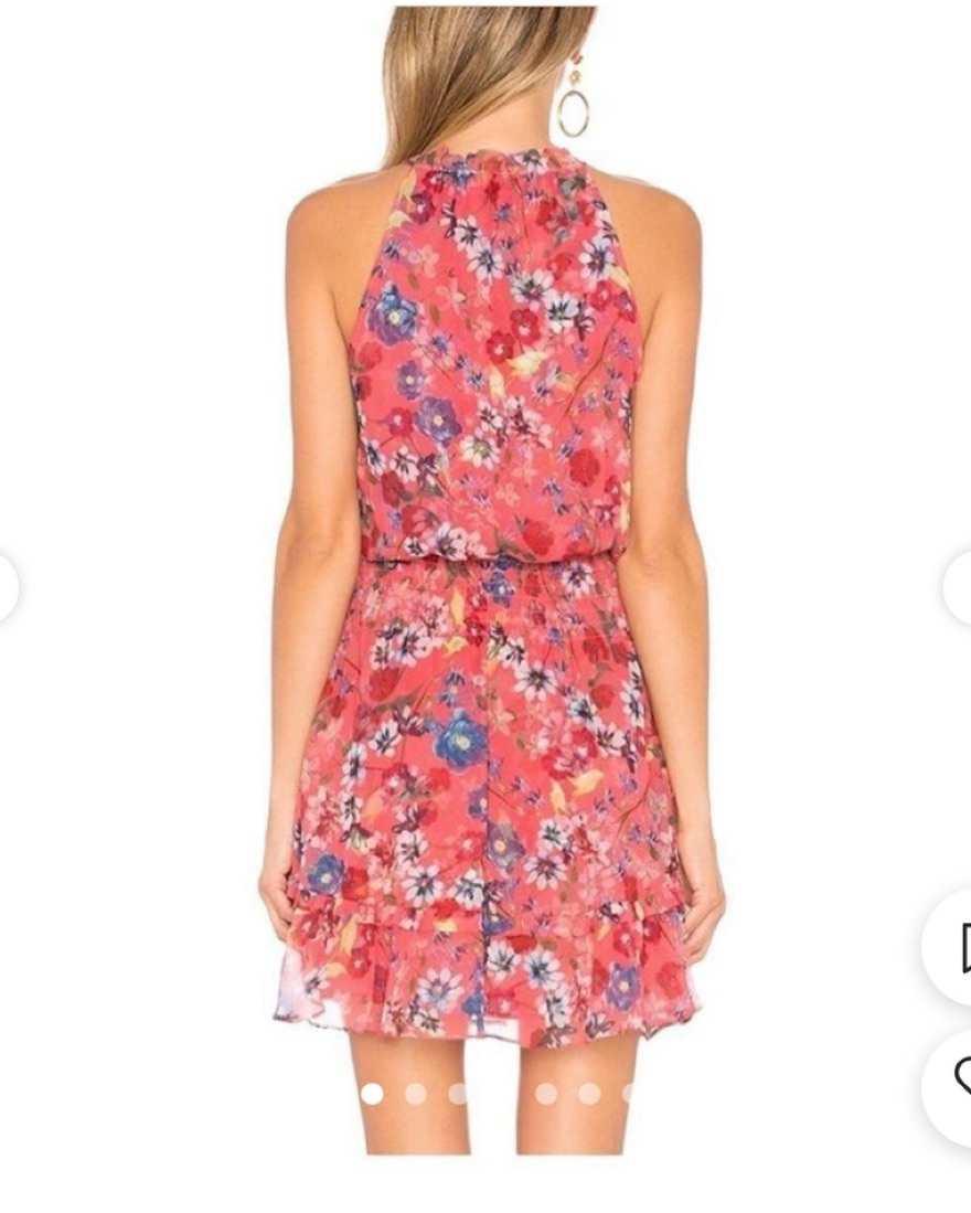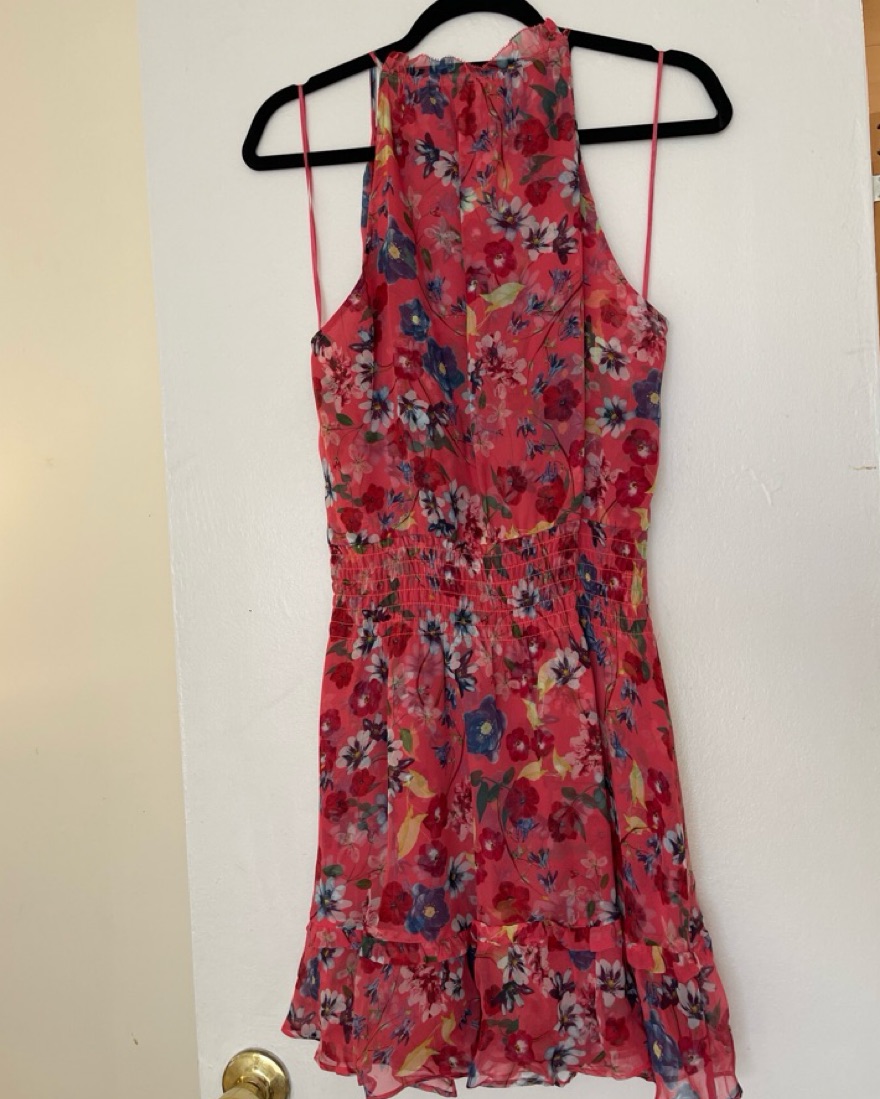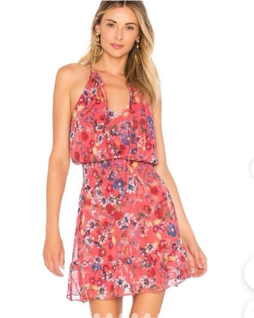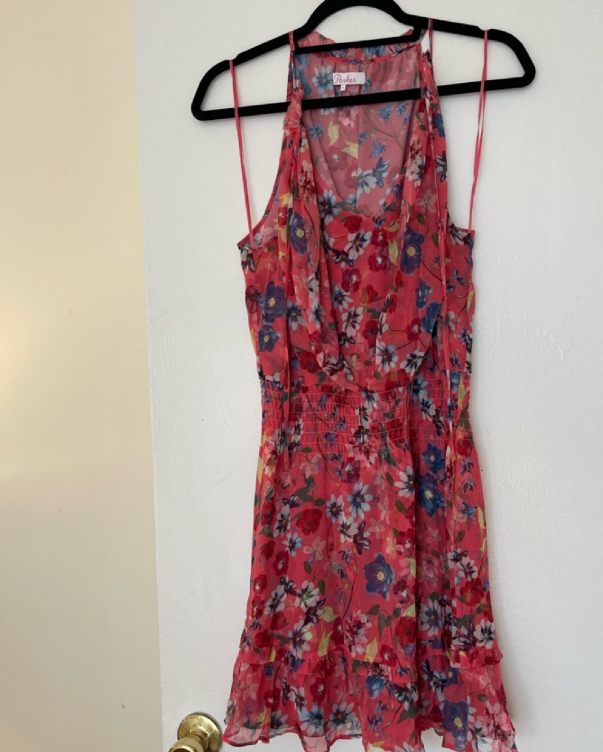 Parker floral mini dress in coral pink. V-neck, elastic waist, fully-lines, sleeveless. Will need to dry clean after so price reflects that.