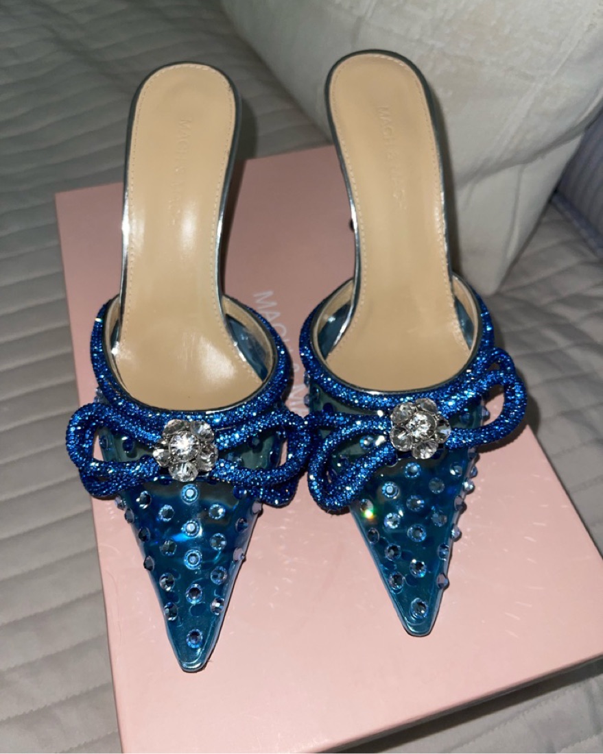 These swavorski crystal heels are the perfect cindarella kitten heels! Even more beautiful in person, guarentee you will get compliments with these beauties. Kitten heel that isnt too tall. Best fits US size 8.