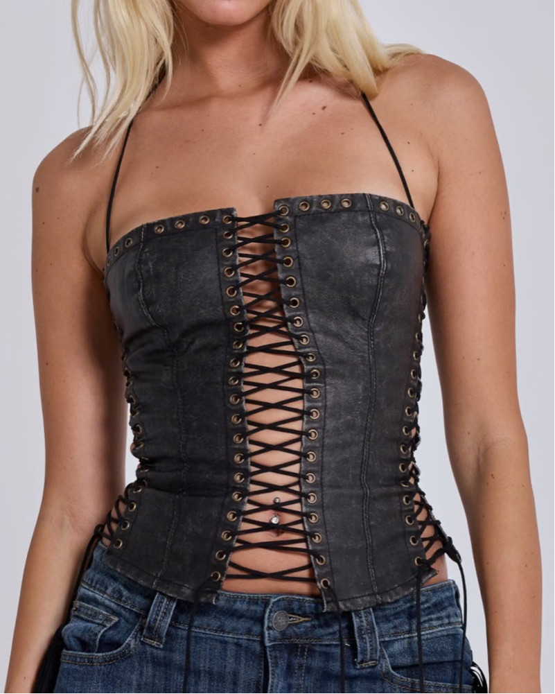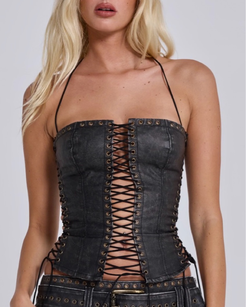 Super adjustable and so fun for a night out! Adjustable lace-up detailing at the front and sides, structured eyelet trims for flattering shape, and a convenient back zip. Happy to add any images needed for sizing <3
