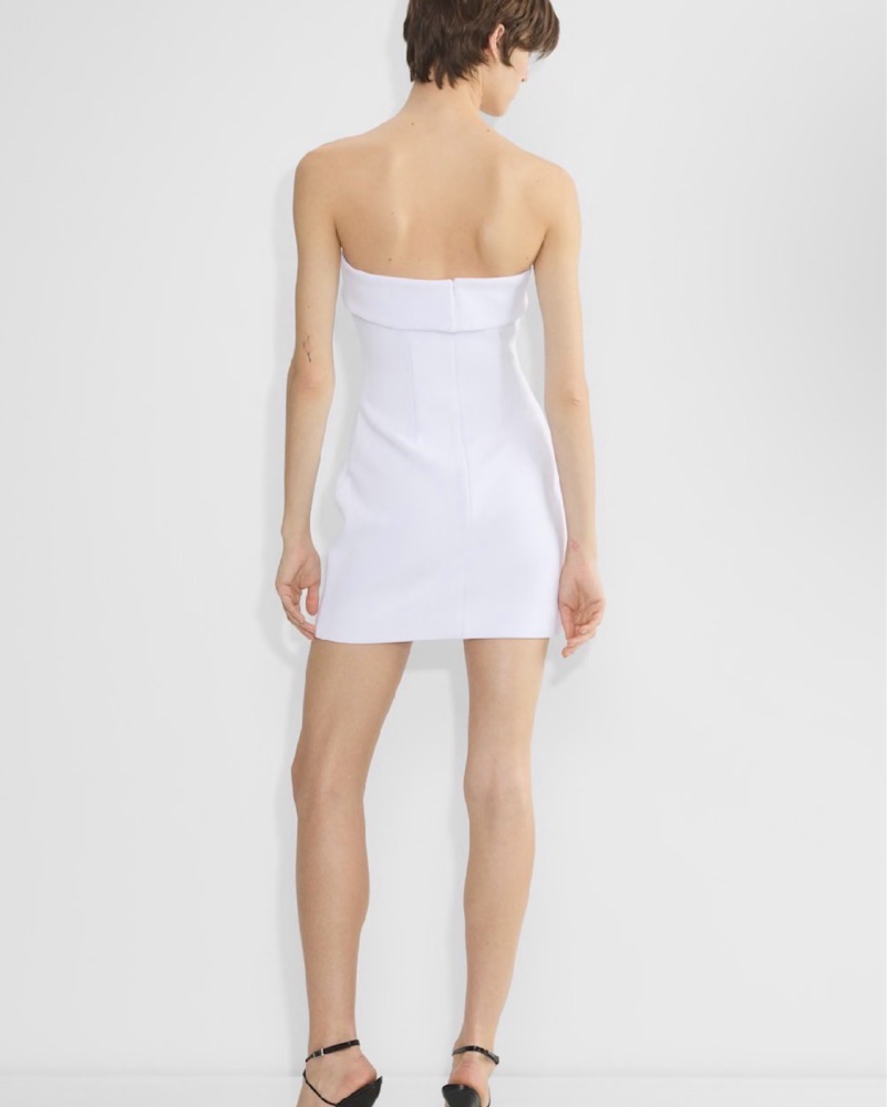 This sleek and sophisticated strapless mini dress is perfect for a night out or special occasion. The figure-hugging silhouette and crepe fabric create a sleek and modern look.