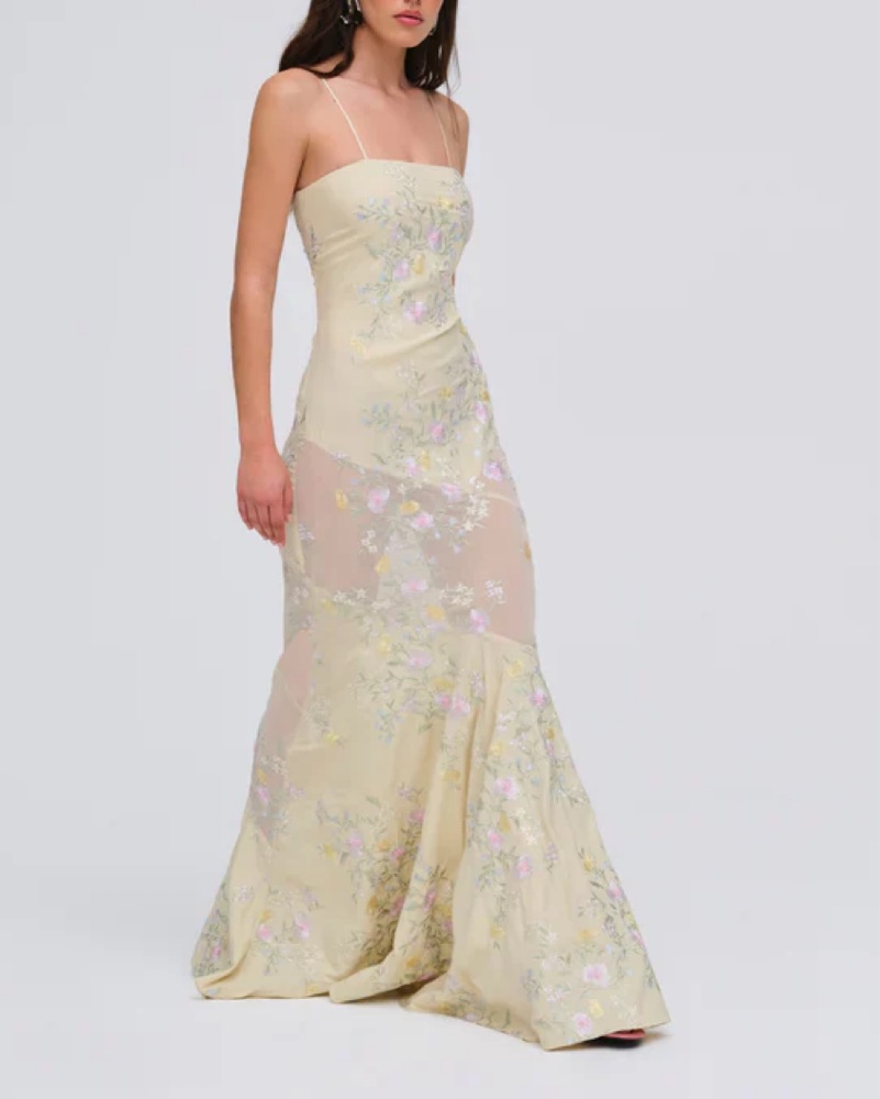 Authentic For Love and Lemons yellow maxi dress size MEDIUM Jacqueline embroidered floral detail. Sheer mesh detail at the thigh area. Best fit for size 6. Adjustable spaghetti straps. Back zip closure. Length pit to hem 51”, width pit to pit 16”
