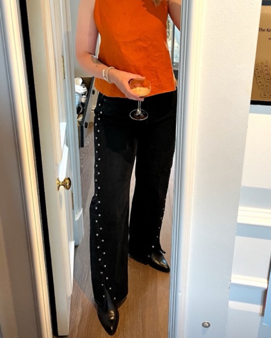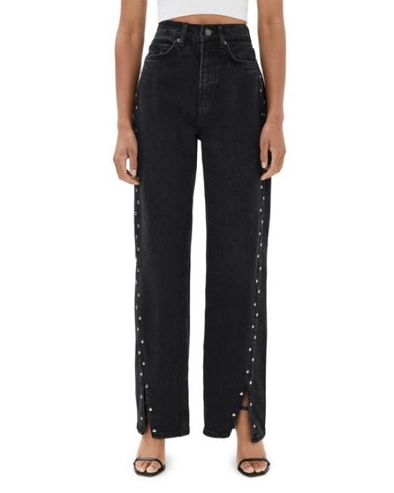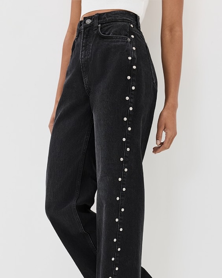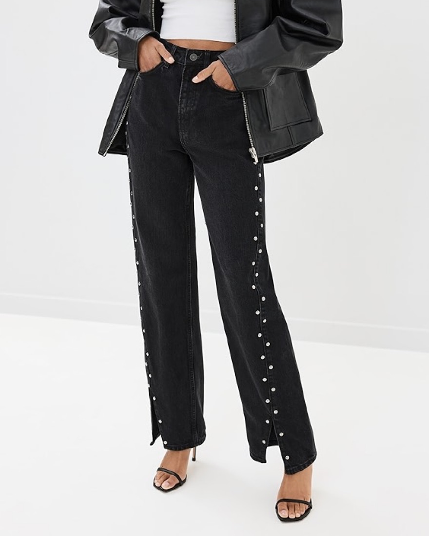 Step out in Western-inspired style in these wide-leg jeans made from nonstretch denim with silvery studs and breezy slit hems.