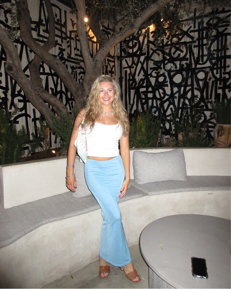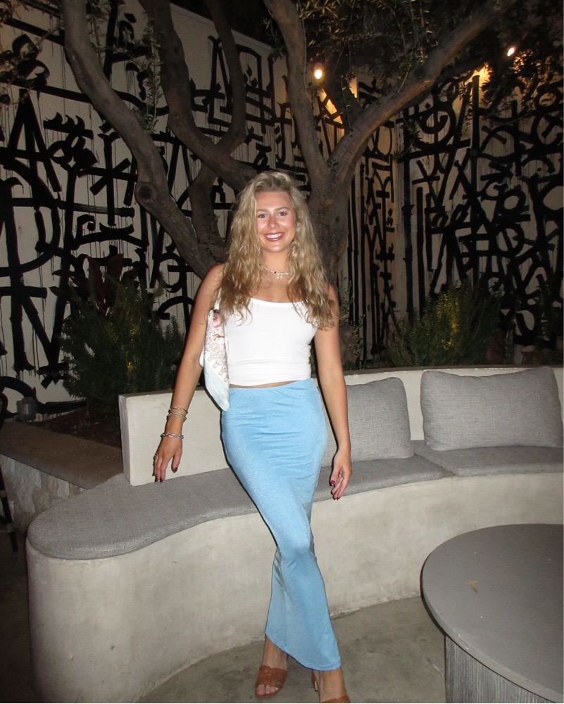 A stylish ensemble perfect for a night out or special occasion. The cropped white top and flowing powder blue maxi skirt create a chic, feminine look.