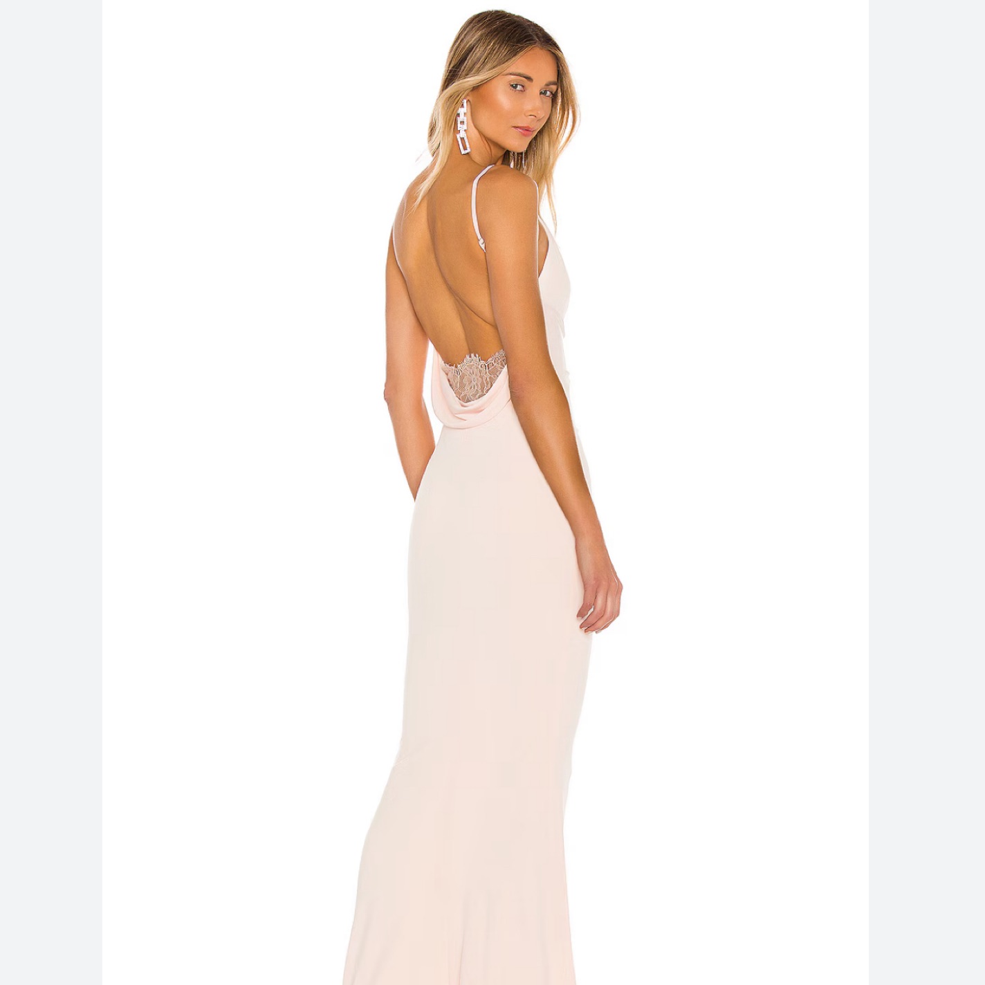 Beyond flattering! Light pink pastel gown will fit an XS or S. Perfect dress for a wedding, formal, black tie, charity event or prom! This is in blush pink but i also have this available in navy if you check out my closet.