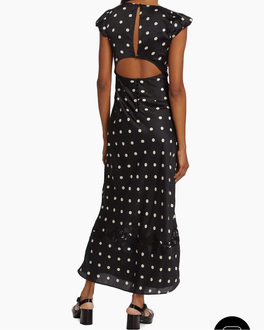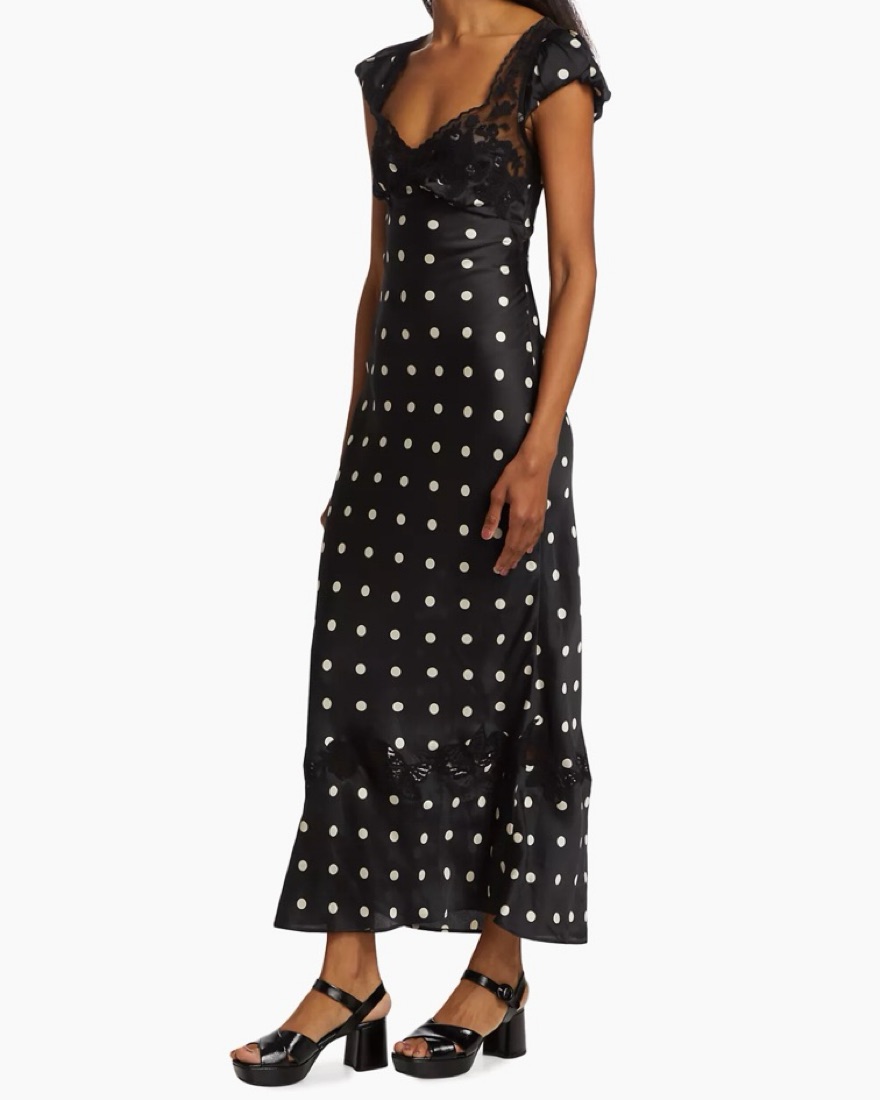 Perfect in polka dot, this stunning maxi dress is featured in a classic, A-line silhouette with butterfly lace-adorned neckline and slightly puffed capped sleeves for an added timeless touch.