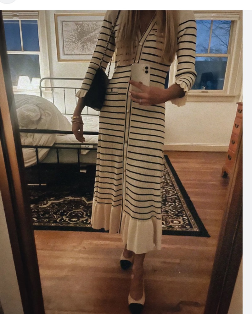 This knit stripy dress is beyond perfect for work or baby showers or religious events! It is super flattering because it is knit and doesn’t hug your tummy. I’m 5’5” and it hits me in the lower shin and makes you look really tall. Get ready for compliments