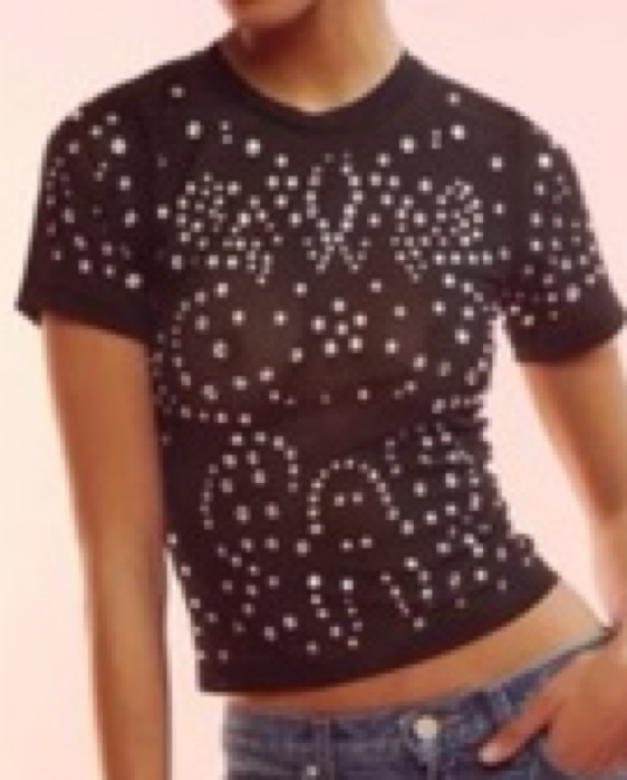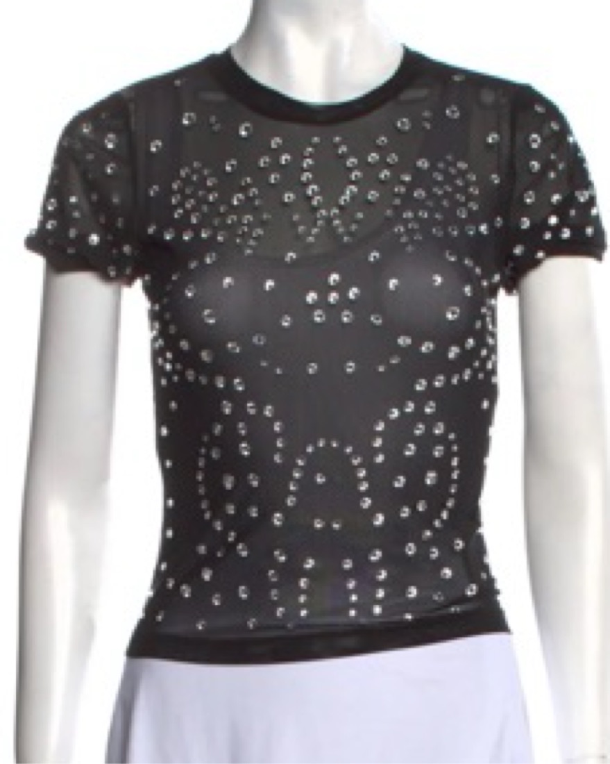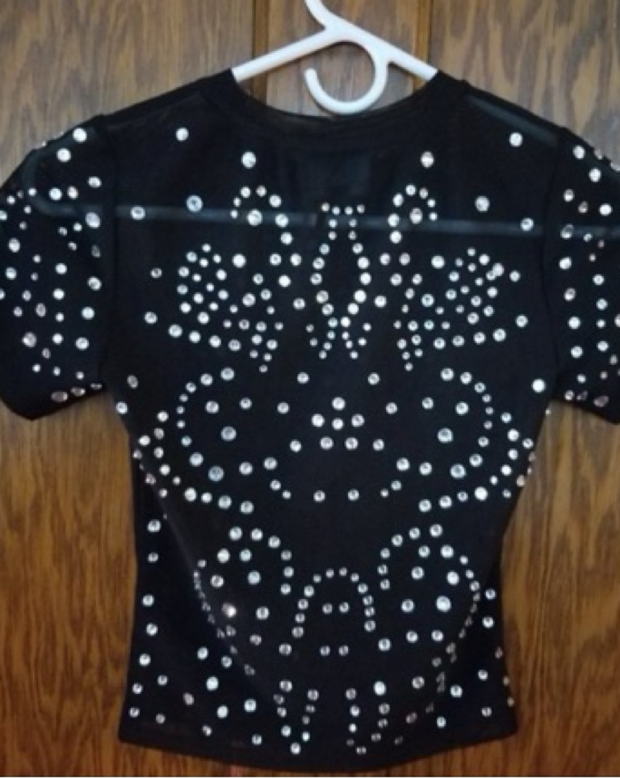 Excellent condition, nylon shirt material bedazzled with large rhinestones on front and back. Very flattering!