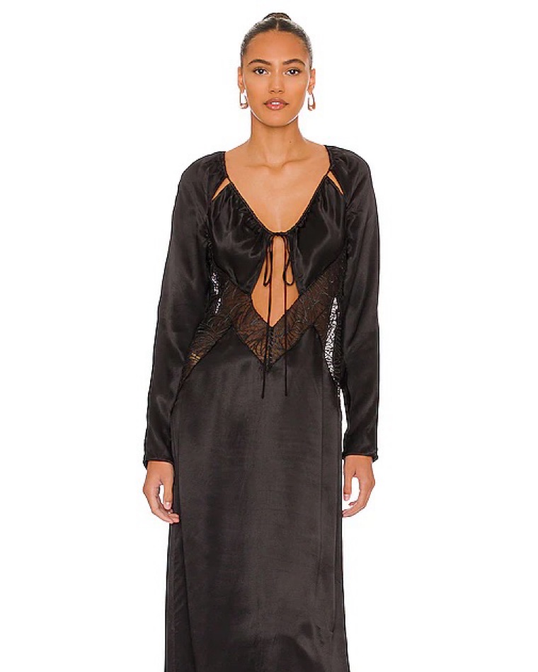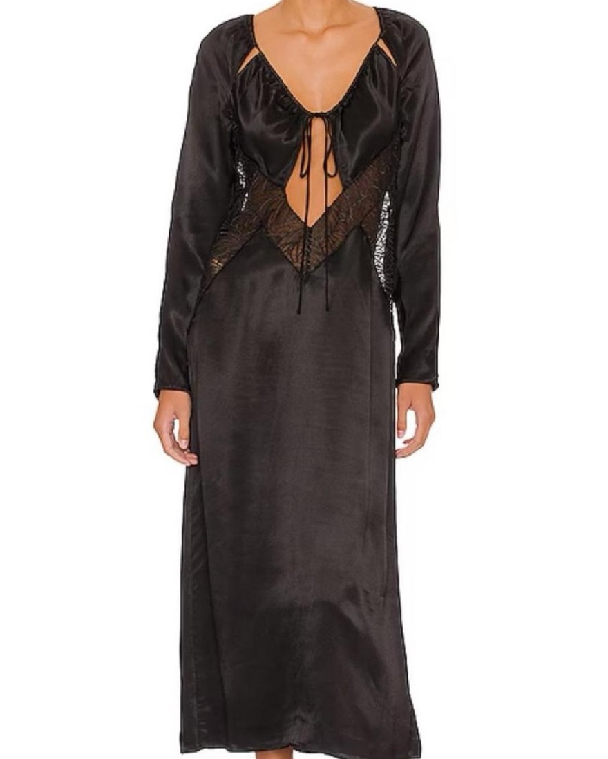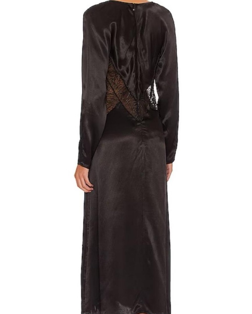 This stunning black satin maxi dress is perfect for a formal occasion. The intricate lace detailing and flattering silhouette will have you feeling confident and ready to celebrate.