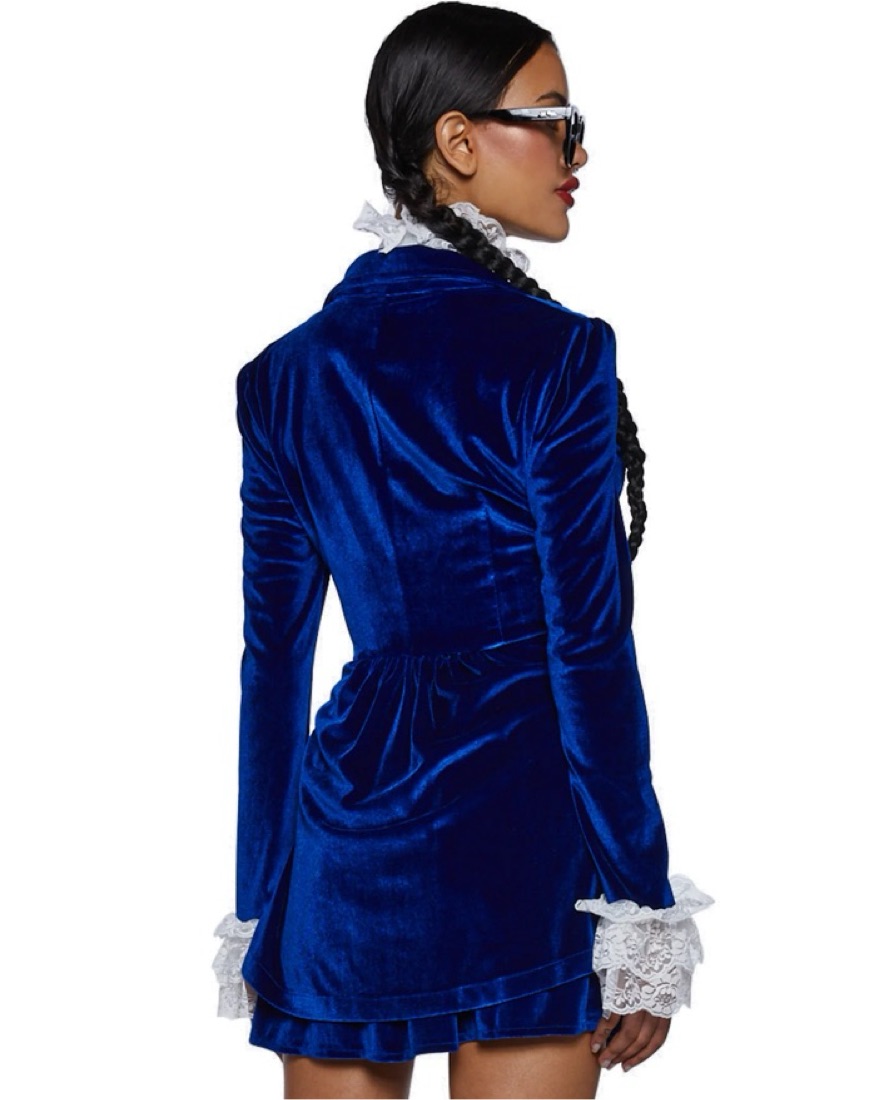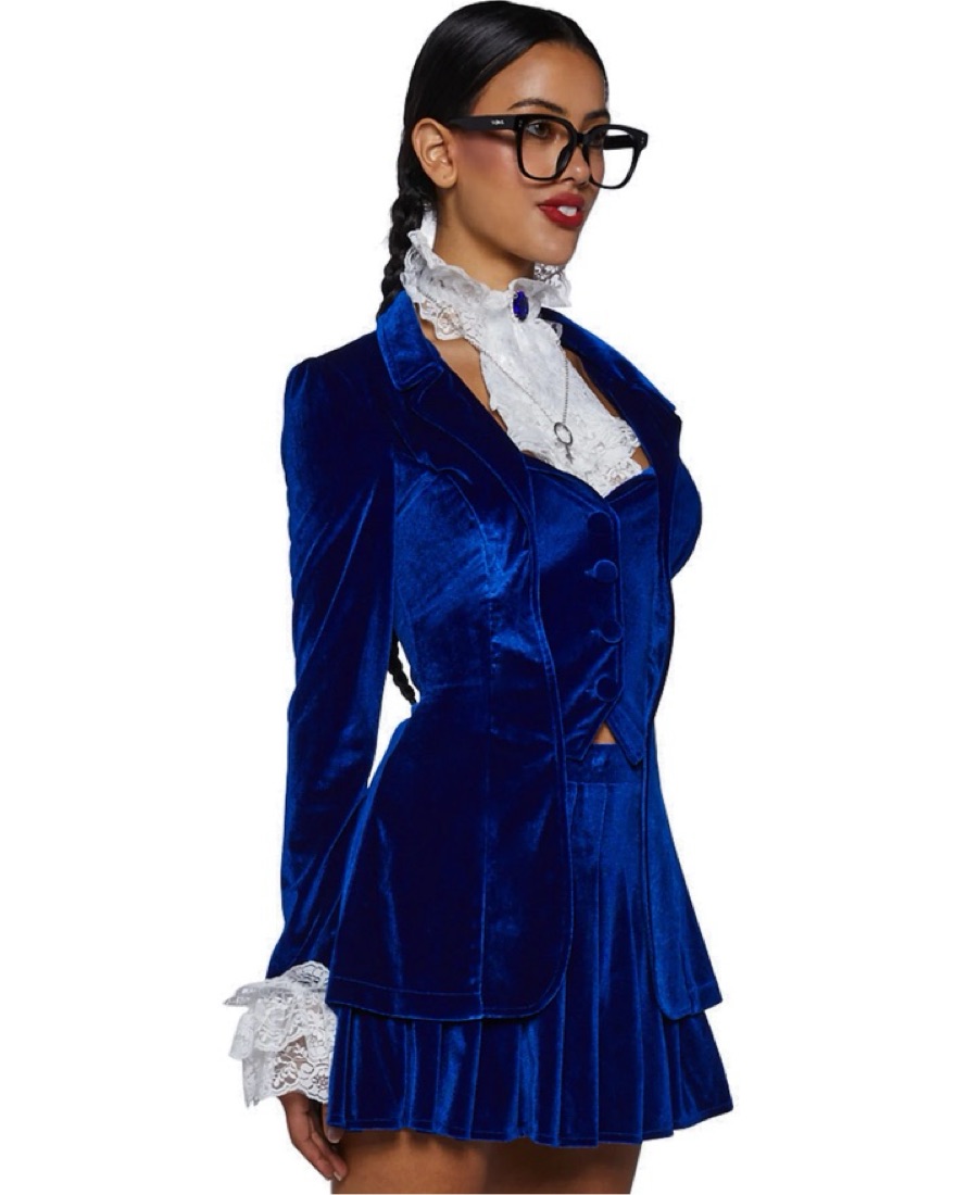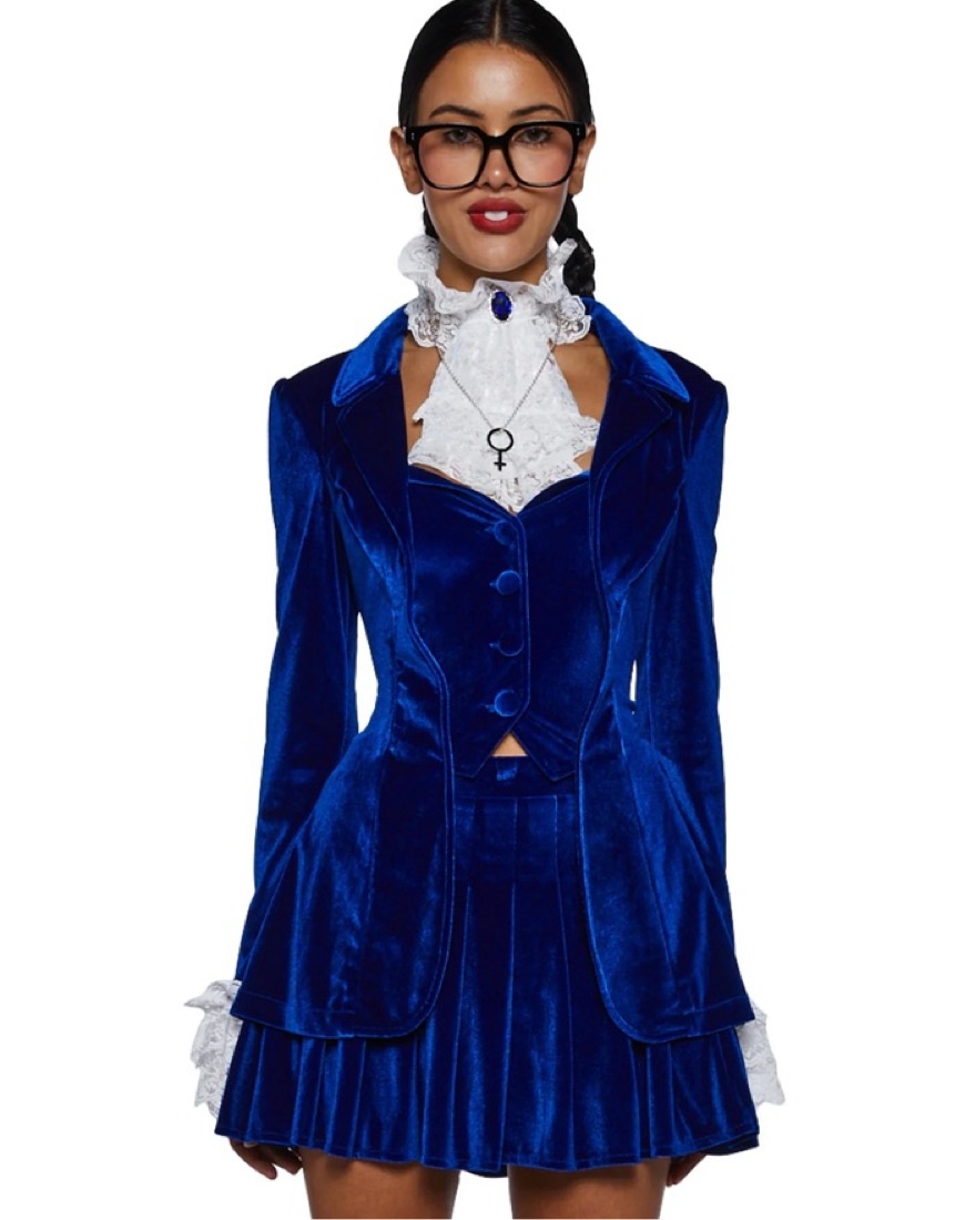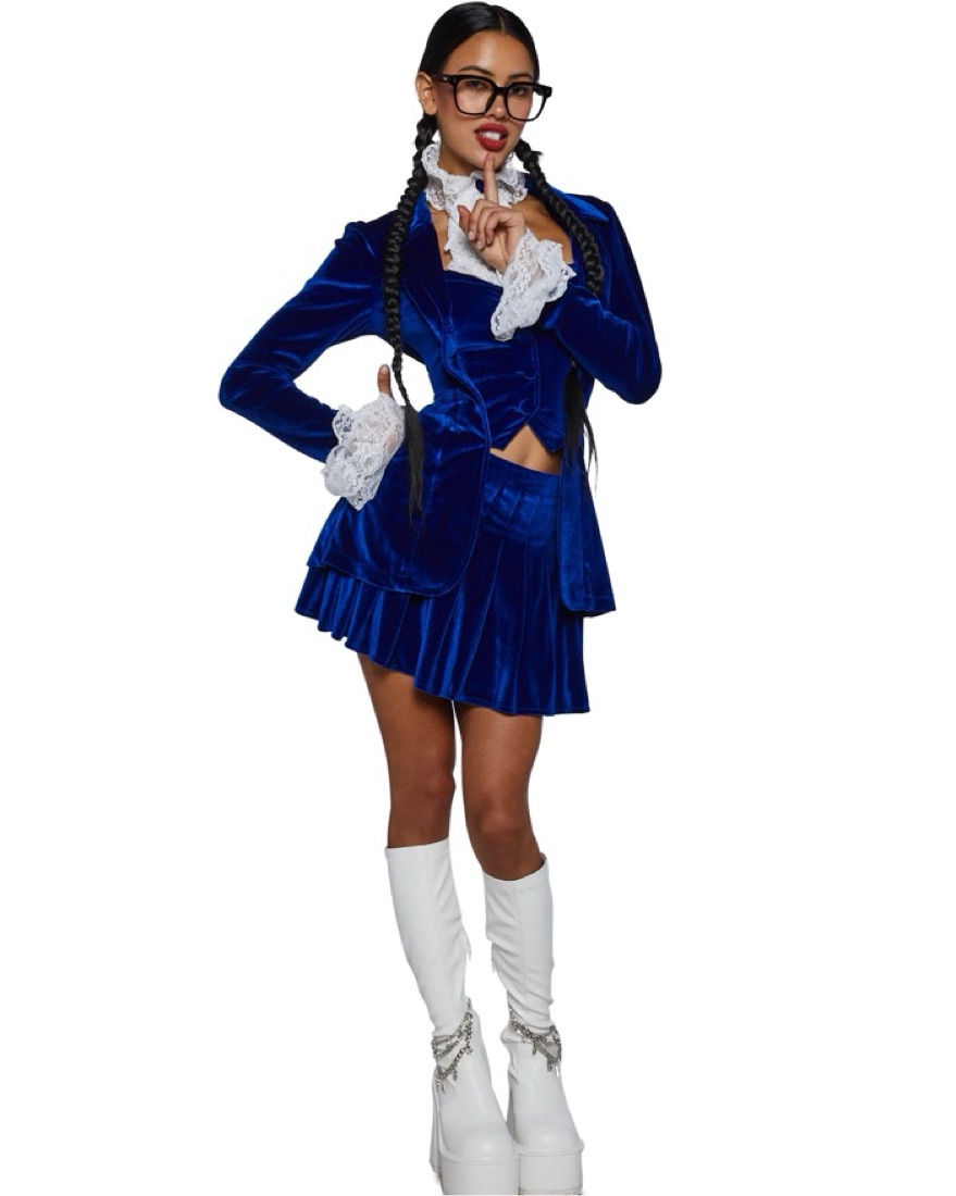 Comes with top, bottom, neckpiece, necklace and glasses. Everything but the shoes! Can fit XXS-S. It is stretchy! Soooo cute on