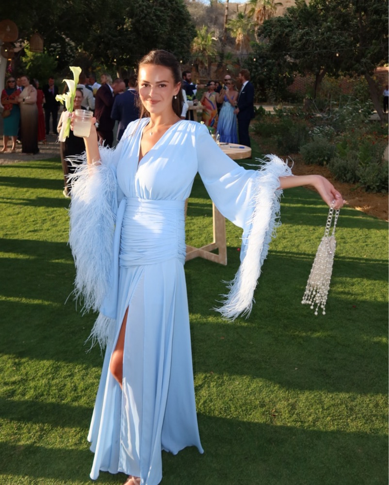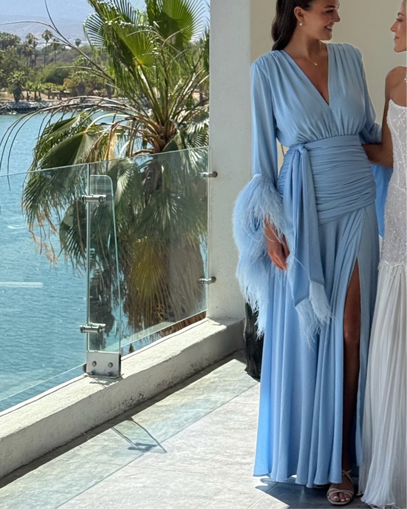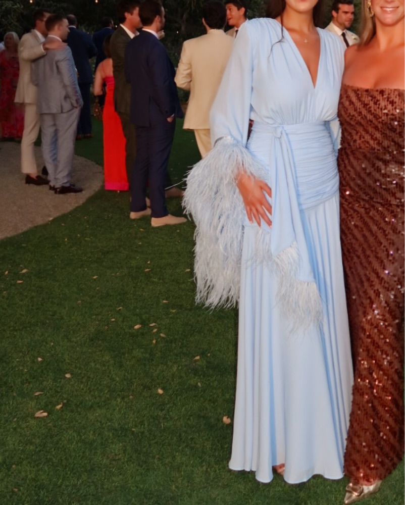Light blue color with ostrich feathers and tie belt. Back zipper closure, small shoulder pads, side slit. Dress is long, I am 5’10