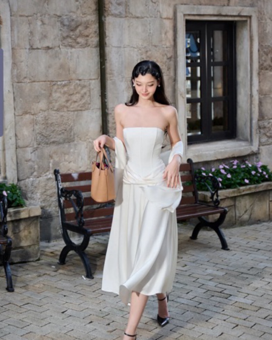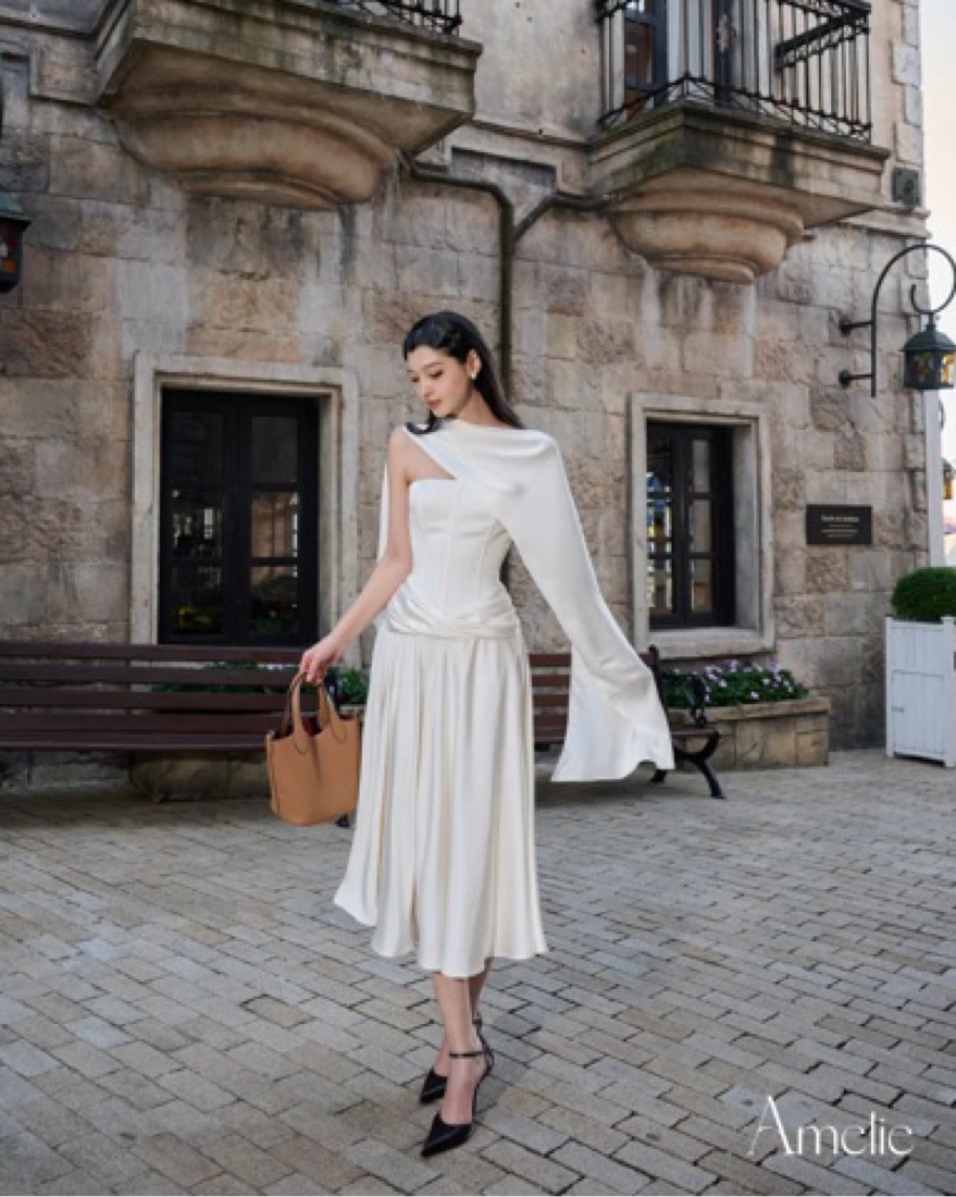Super cute white satin midi dress with scarf! From vietnamese brand Amelie. Size M! Perfect for bachelorette or grad