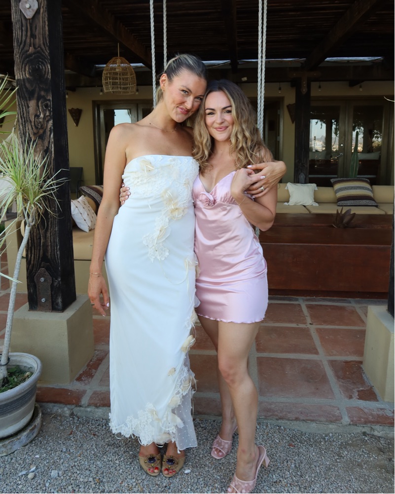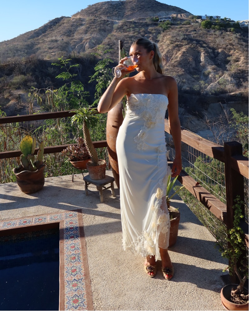 Y2K floral appliqué details, a mesh slit and strapless silhouette. My dream dress and perfect for my bachelorette. Would love to share it with someone else!