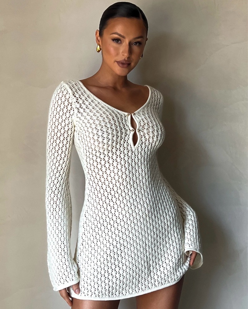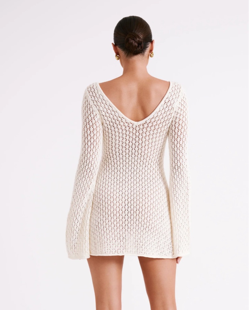 Knit mini dress with bell sleeves and mid-low back. Wearing with a nude bra works just fine (as pictured). Off white. Perfect for bach, tropical vacays, and summer plans.