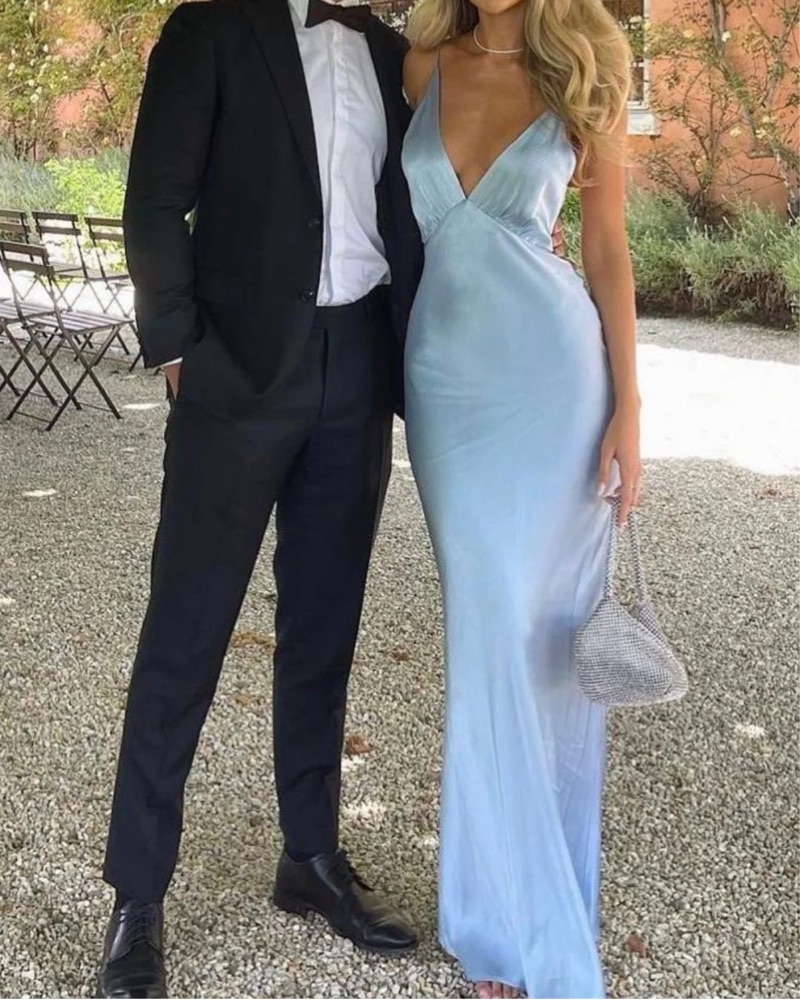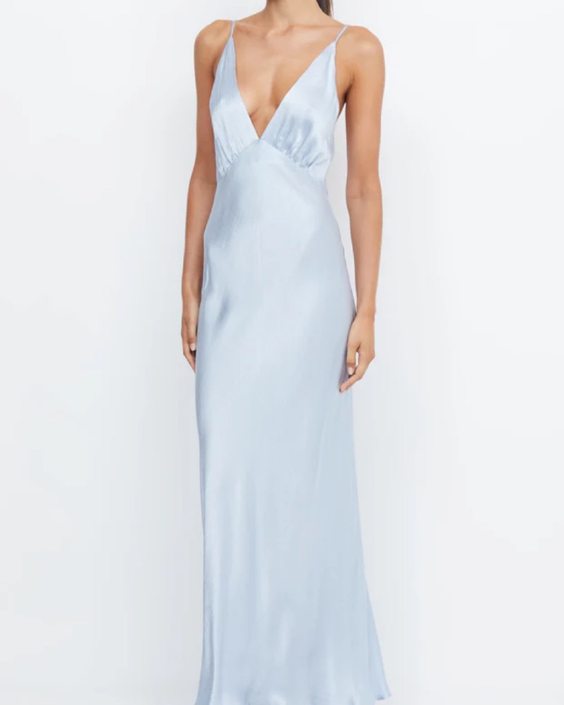 In Dusty Blue, currently sold out on Revolve. Perfect for a destination or summer wedding for a guest.
