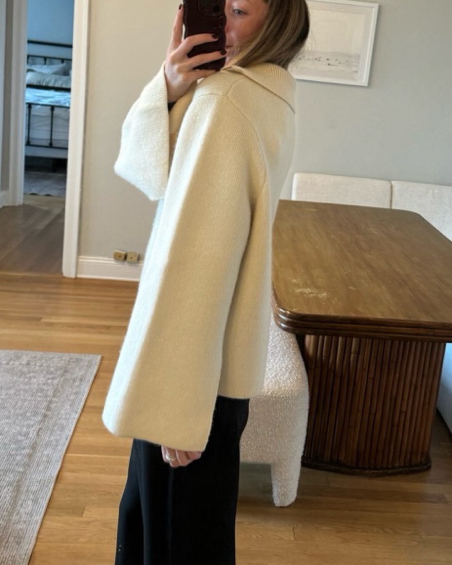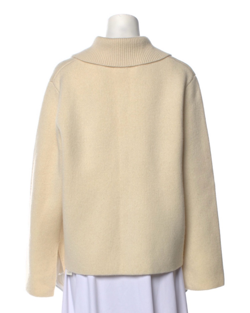 100% cashmere, wide arm, double zippers, full zip turtle neck or roll for collar. Chicest ski trip sweater. Color is cream.