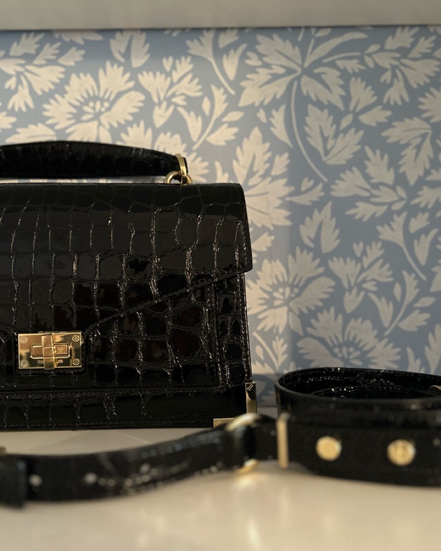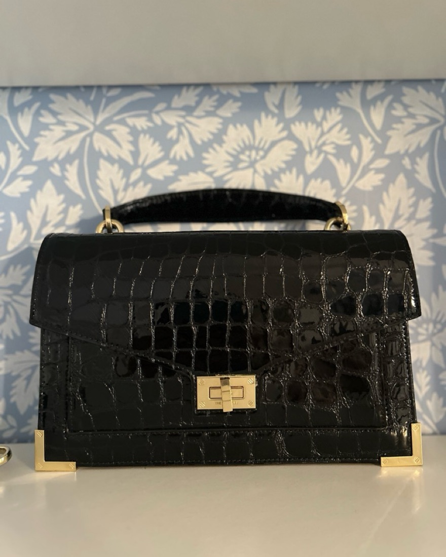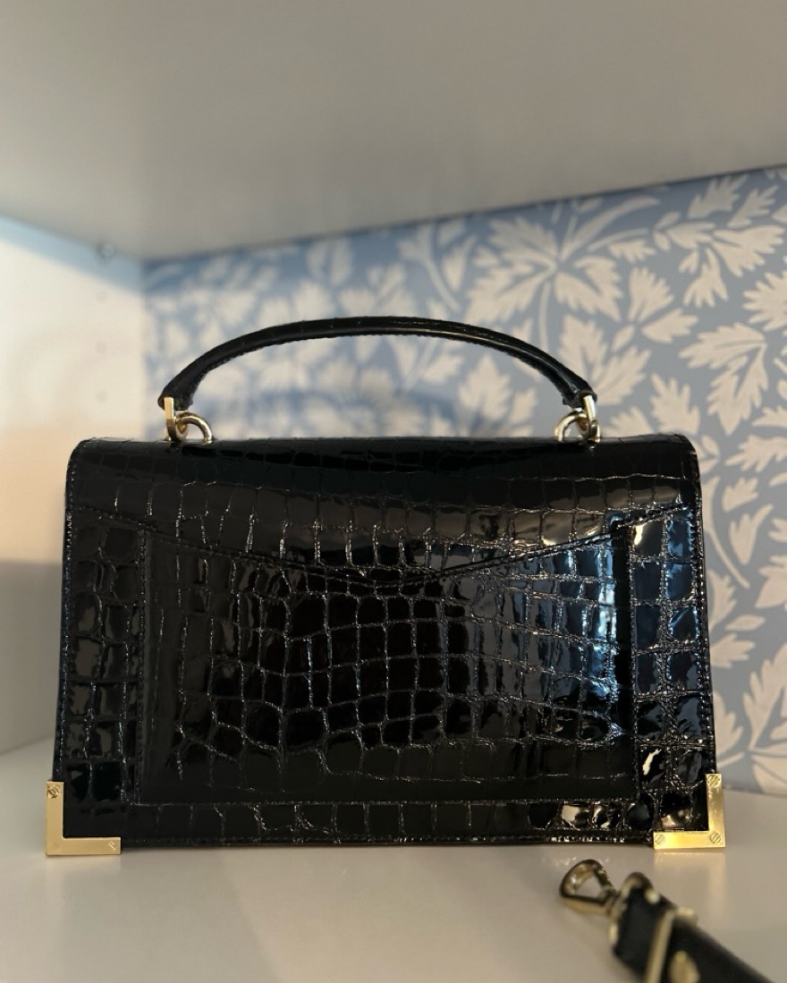 Patent leather croco print, gold tone hardware, detachable strap, 11 x 6.5 x 3.15.