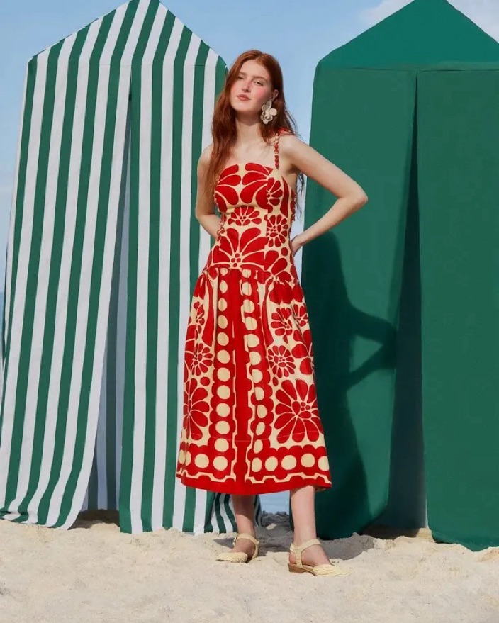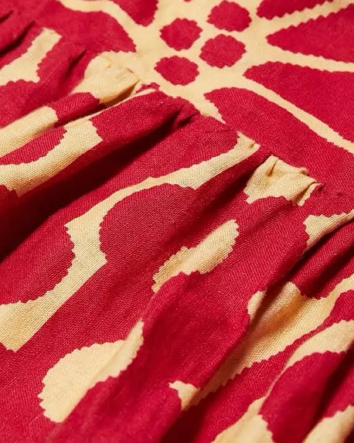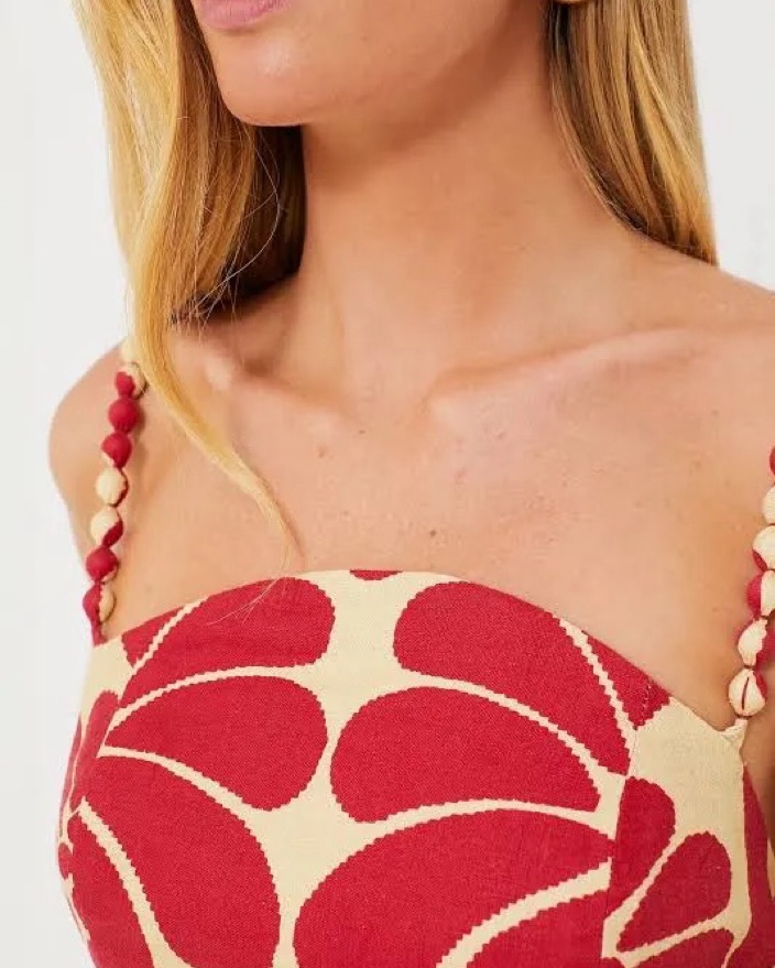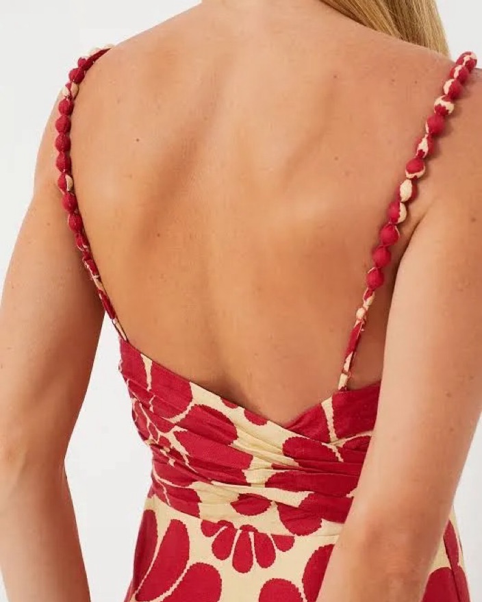 This cream white and red floral print linen dress features ruched detailing, beaded spaghetti straps, an open back, a concealed side zip fastening, and a mid-length straight hem. Perfect for a night out or a chic brunch.