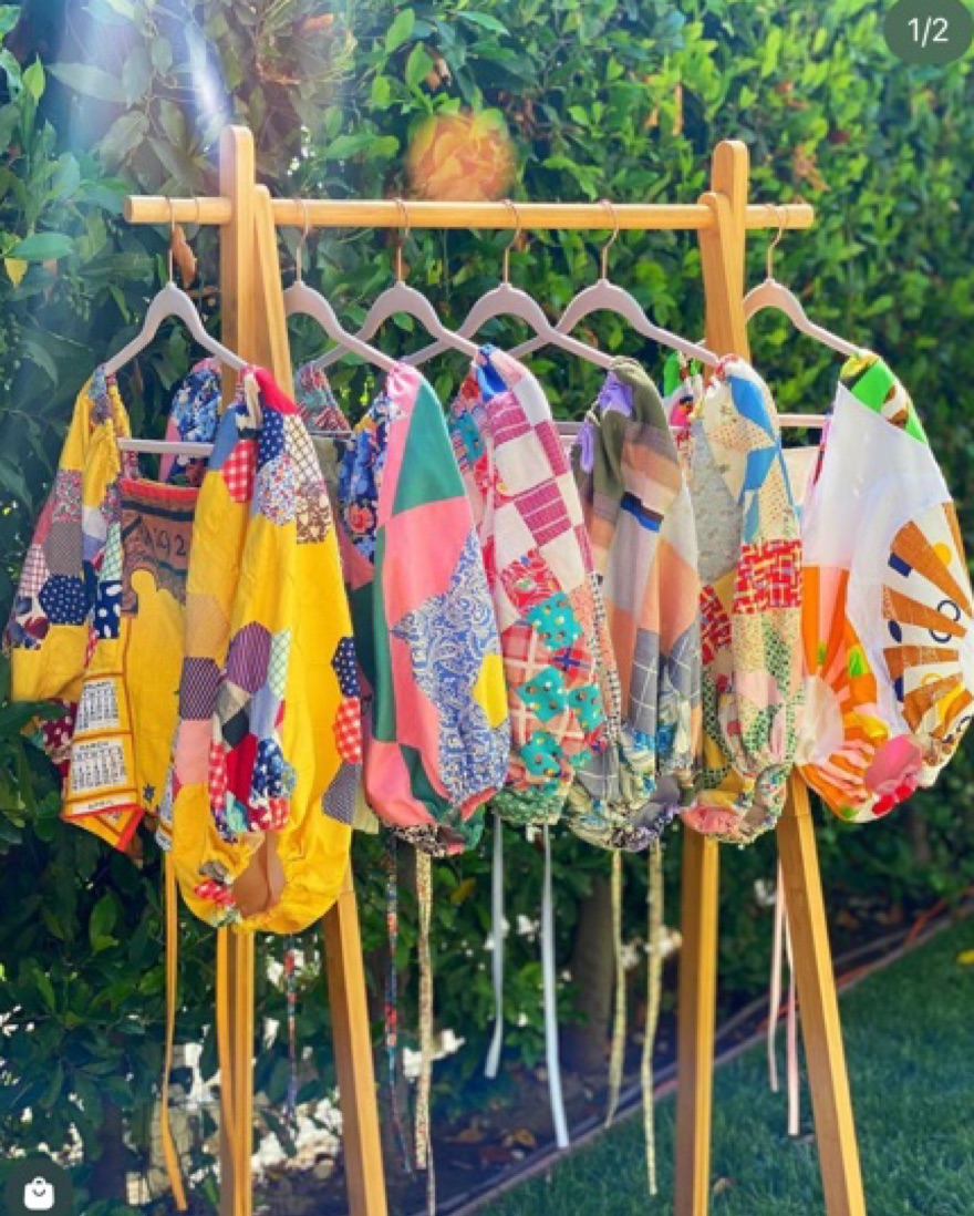 by @selina_sanders on IG - cult indie upcycling label. this is a true one of a kind top made from a vintage tea towel with cute puppies on it with dramatic puff sleeves made from a vintage quilt. long sleeves but light and breathable for summer. open size but would best fit a size M-L