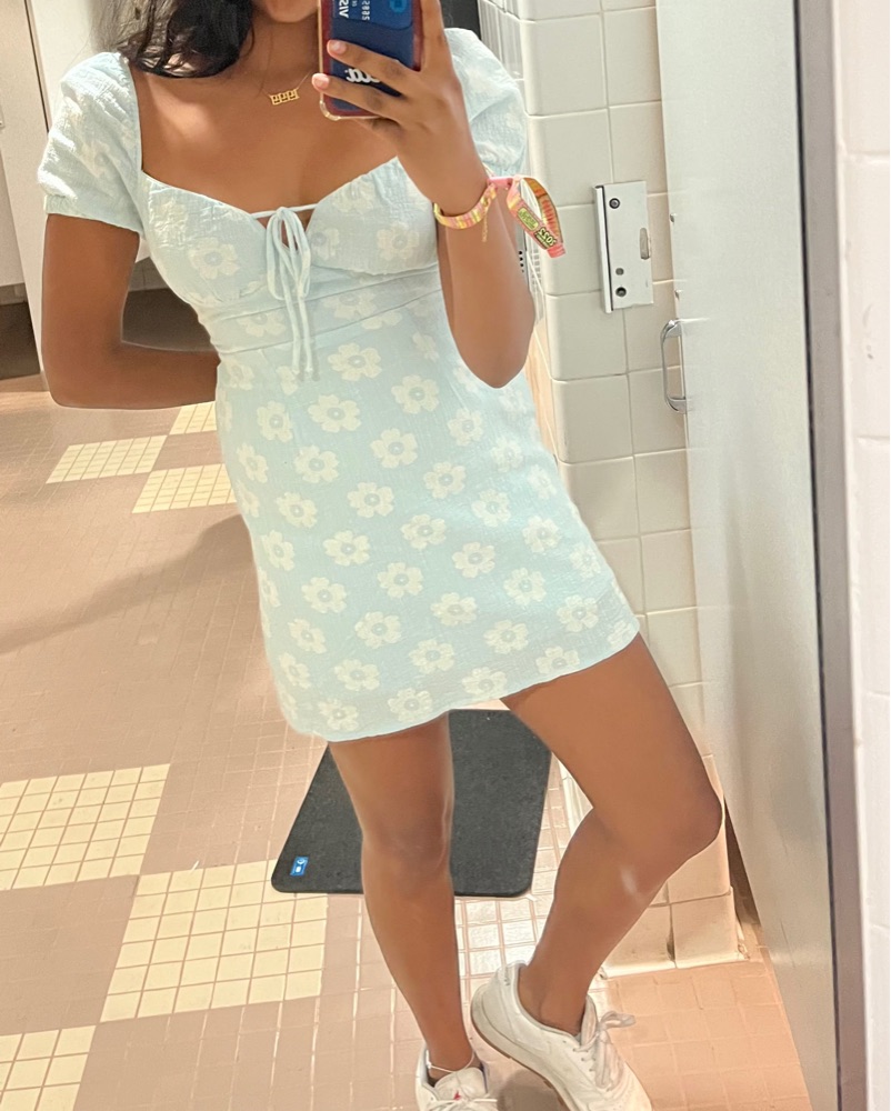 This charming floral dress features a flattering puff sleeve design and a figure-skimming silhouette. It's perfect for a summer garden party or brunch with friends.