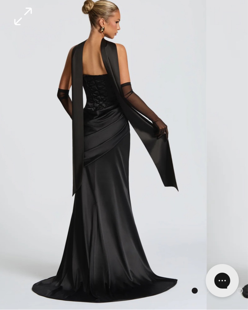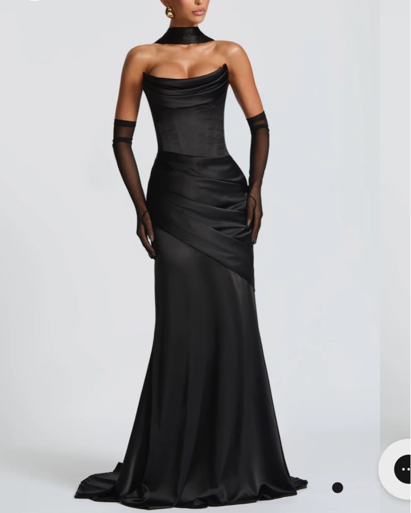 The Kensington Maxi Dress in black is a luxurious, sophisticated choice for any formal occasion. The stretch satin fabric drapes elegantly on the fit & flare skirt with a train, while the strapless neckline and boned bodice create a structured and flattering silhouette. The pleated cowl and lace up
