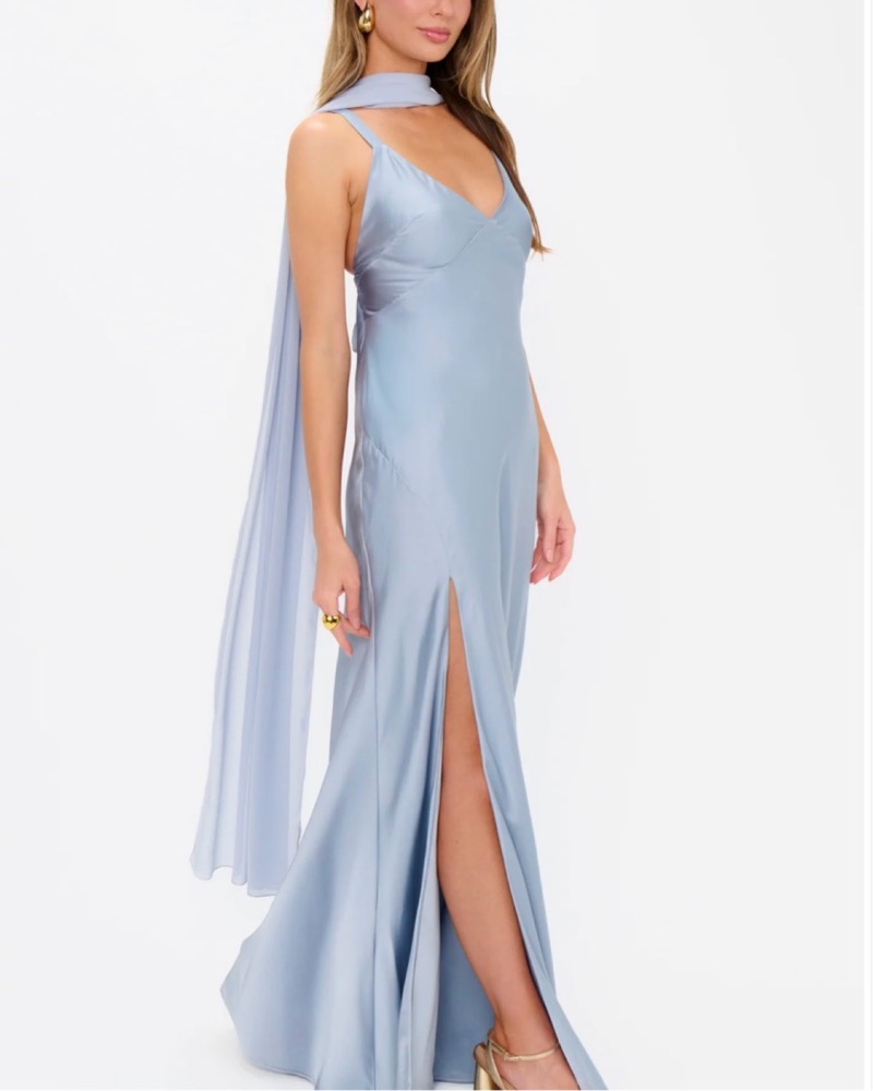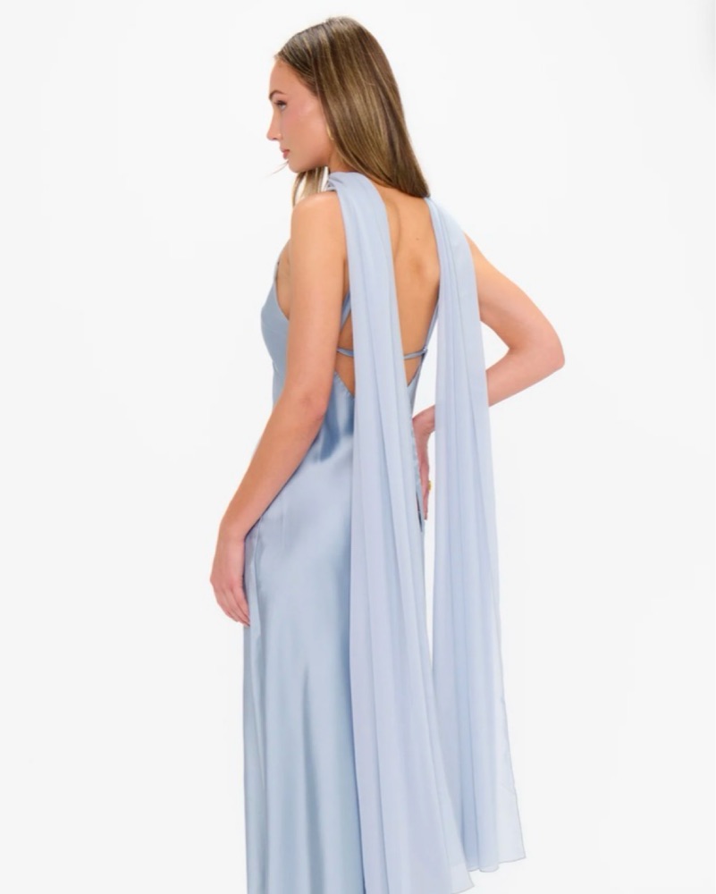 ✨ Includes soiree shawl in the matching steel blue satin. This XXS gown is open back and had criss cross ties. Flattering, floor length dress with slit. Like new, used once.