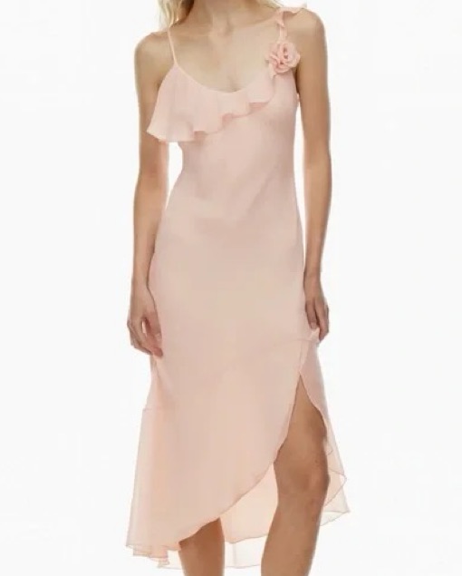 This is a ruffled fit-and-flare dress with adjustable straps and a rosette detail. It's made with Fête Chiffon™ — lightweight, semi-sheer fabric
