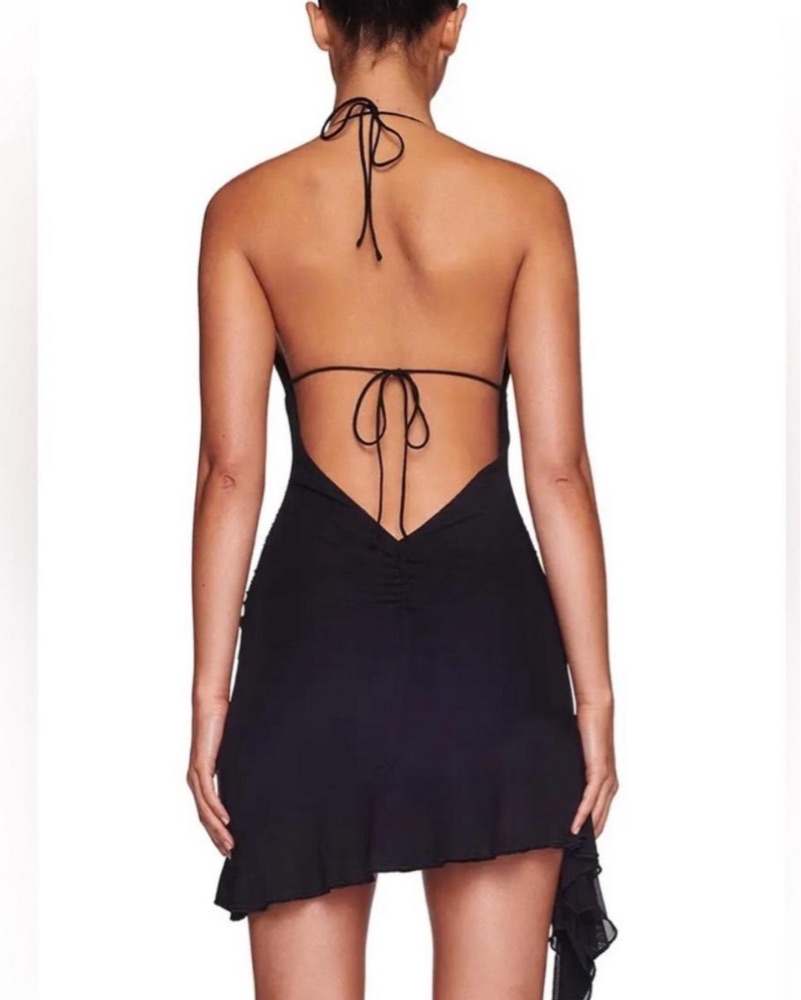 Sooo sexy and elegant, open back, deep v neck and ruffle details