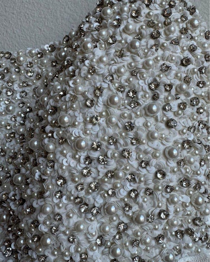 This stunning mini dress features an intricately beaded bodice and a flowy, metallic skirt, perfect for a formal event or special occasion. Perfect for bridal events.